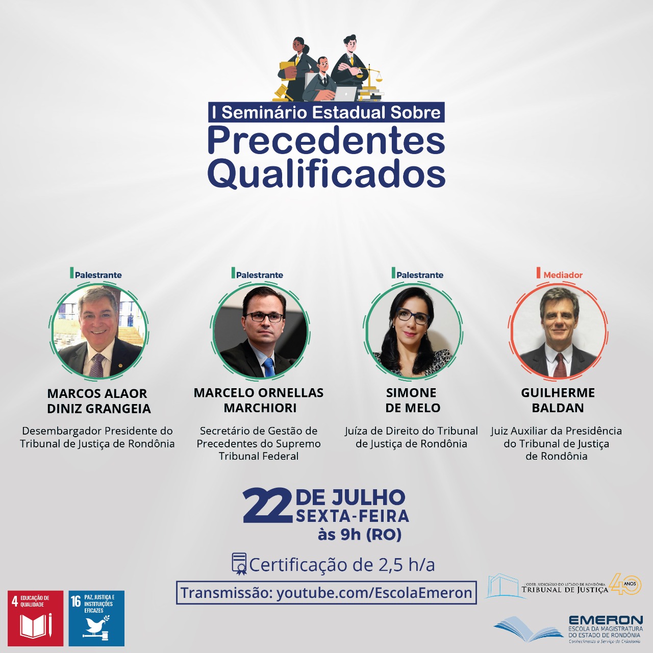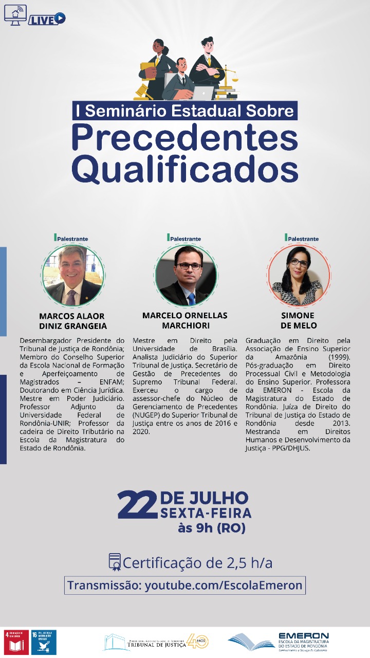 Na próxima sexta-feira, 22/7, o Tribunal de Justiça de Rondônia e a Escola da Magistratura do Estado (Emeron) promovem o I Seminário Estadual sobre Precedentes Qualificados, com transmissão ao vivo pelo canal da Escola (youtube.com/EscolaEmeron). Coordenado pelo Núcleo de Gerenciamento de Precedentes e de Ações Coletivas (Nugepnac) e pela Comissão Gestora de Precedentes e de Ações Coletivas (Cogepac), o evento é aberto ao público e terá certificação de 2,5 horas-aula, mediante preenchimento de formulário de frequência disponibilizado durante a realização do seminário.