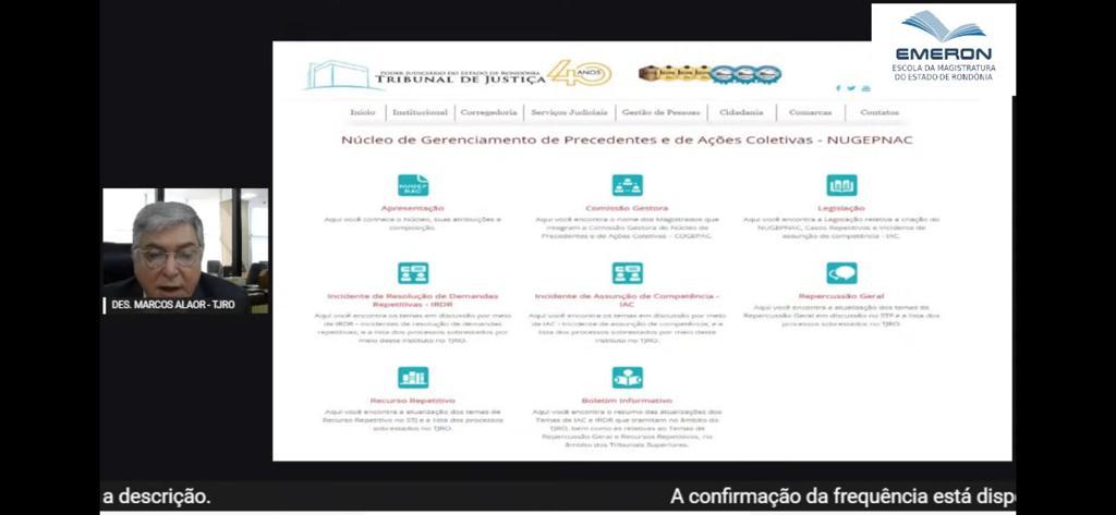 Ao abrir o Seminário, o presidente do Tribunal de Justiça de Rondônia, desembargador Marcos Alaor Diniz Grangeia, apresentou um resumo dos conceitos, ressaltou a importância dos precedentes qualificados - decisões judiciais que servem de exemplo para outros casos - e deu destaque à atuação do Núcleo de Gerenciamento de Precedentes e de Ações Coletivas – Nugepnac, do Tribunal de Justiça de Rondônia, e às ferramentas disponíveis nas páginas dos tribunais superiores brasileiros que sistematizam os precedentes e a jurisprudência.