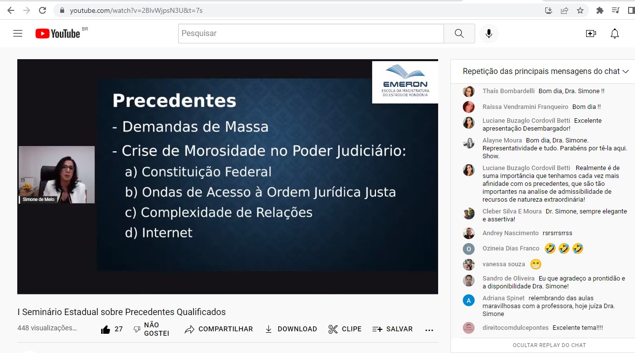 Magistrados (as), advogados (as), servidores (as) e outros operadores do Direito, além de acadêmicos (as), participaram na manhã de sexta-feira, 22, do I Seminário Estadual Sobre Precedentes Qualificados, promovido pela Escola da Magistratura de Rondônia, com a participação de magistrados do Poder Judiciário de Rondônia e do secretário de Gestão de Precedentes do Supremo Tribunal Federal, Marcelo Ornellas Marchiori. Mais de 400 pessoas acompanharam as palestras, que foram transmitidas pelo canal da Emeron no Youtube.