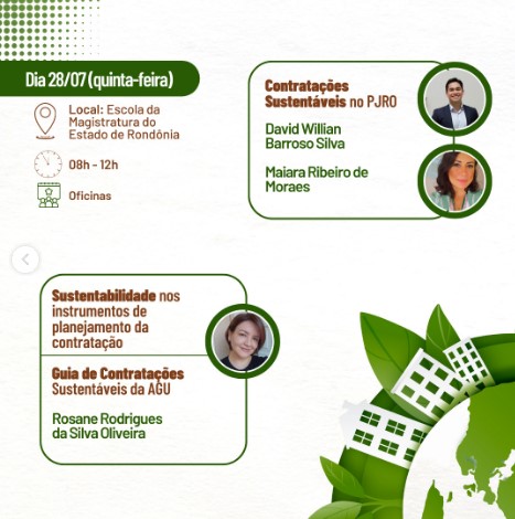 Os servidores David Willian Barroso Silva, do Departamento de Aquisições e Gestão de Patrimônio (Deagesp), e Maiara Moraes, coordenadora do Núcleo de Acessibilidade, Inclusão e Gestão Socioambiental (Nages), abrem o evento com uma exposição sobre contratações, trazendo a contextualização histórico-normativa da sustentabilidade alinhada à Resolução 400/CNJ, que dispõe sobre o tema. A diretora da Divisão de Aquisições do TJRO, Rosane Rodrigues da Silva, tratará dos aspectos técnicos que envolvem alinhamento de termos de referência e estudos preliminares a essas normativas e, ao final, fará uma apresentação do Guia de Contratações Sustentáveis da Advocacia Geral da União.