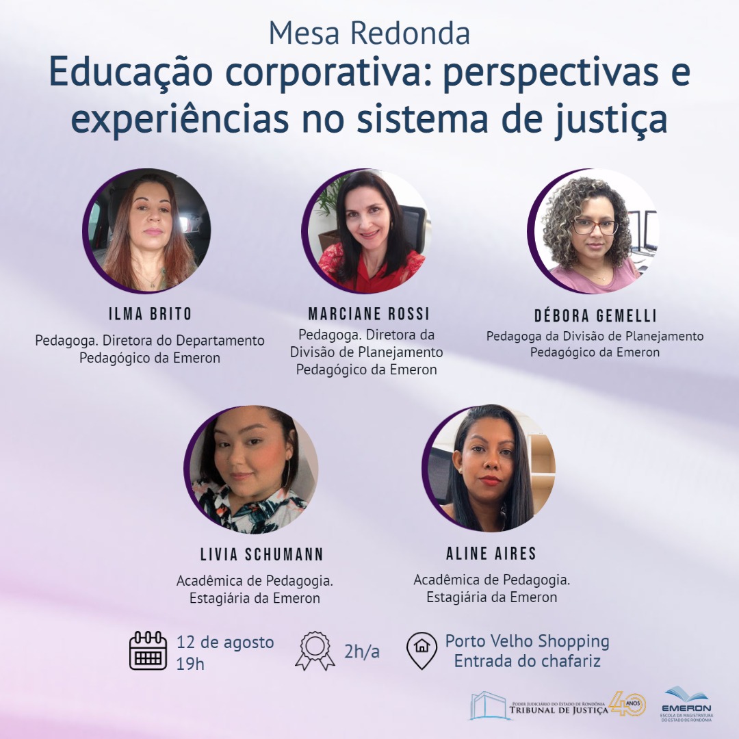 Nesta sexta (12), às 19h, acontece a mesa redonda Educação Corporativa: Perspectivas e experiências no Sistema de Justiça, aberta ao público geral. Participarão da mesa as pedagogas Ilma Brito, diretora do Departamento Pedagógico (Deped) da Emeron, Marciane Rossi, diretora da Divisão de Planejamento Pedagógico (Diped), Débora Gemelli, chefe da Seção de Planejamento de Educação a Distância, e as estagiárias Lívia Schumann e Aline Aires, ambas também do Deped e acadêmicas de Pedagogia.