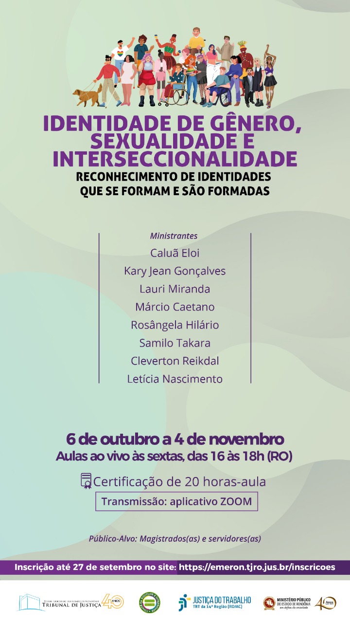 Estão abertas, até a próxima terça-feira (27), as inscrições para os dois primeiros cursos promovidos pelo Comitê Gestor da Política Interinstitucional de Equidade de Gênero, Raça e Diversidade, composto por membros e servidores(as) do Tribunal de Justiça de Rondônia, Ministério Público do Estado e Tribunal Regional do Trabalho da 14ª Região (RO/AC). Intituladas “Identidade de Gênero, Sexualidade e Interseccionalidade” e “Letramento Racial Crítico”, as formações são destinadas, no âmbito do TJRO, a magistrados(as) e servidores(as) que exerçam atos decisórios e atuem no desenvolvimento de ações e políticas institucionais internas.