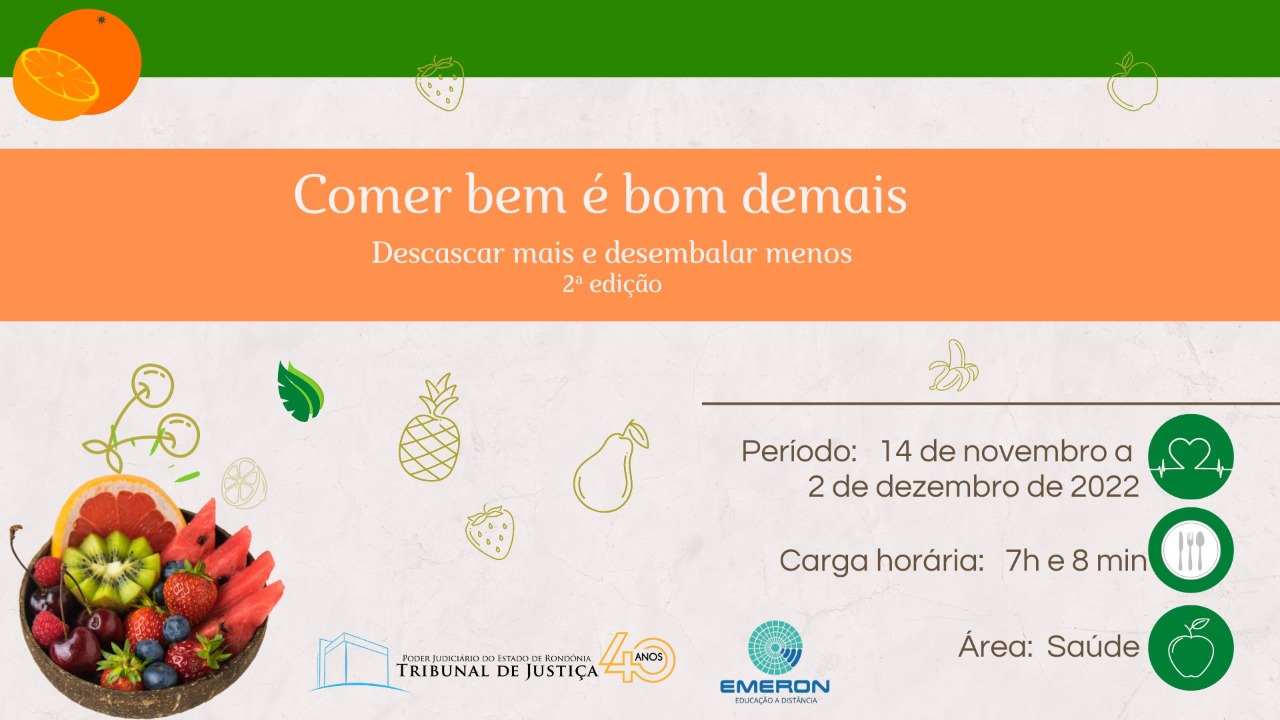 A Escola da Magistratura do Estado de Rondônia (Emeron) está com inscrições abertas, até o próximo dia 4 de novembro, para o curso Comer Bem é Bom Demais: “Descascar mais e desembalar menos” – 2ª edição. Desenvolvida na modalidade Educação a Distância por meio do Ambiente Virtual de Aprendizagem (AVA) da Emeron, a formação é destinada a servidores(as) e magistrados(as) do Tribunal de Justiça de Rondônia, das comarcas do interior e capital, e acontecerá de 14 de novembro a 2 de dezembro.