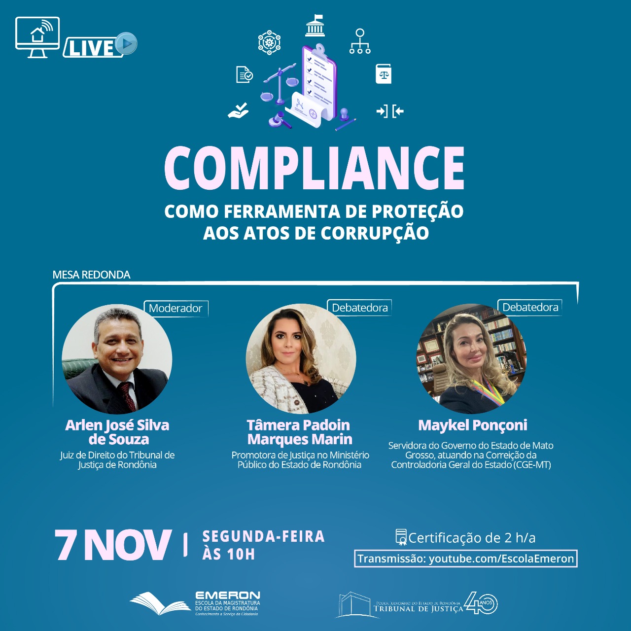 A Escola da Magistratura de Rondônia (Emeron) promove na próxima segunda-feira, dia 7 de novembro, às 10h da manhã, a live “Compliance como Ferramenta de Proteção aos Atos de Corrupção”. No formato mesa-redonda, a transmissão é aberta ao público interno e externo do Tribunal de Justiça do Estado pelo canal de YouTube da Escola (youtube.com/EscolaEmeron), com certificação de 2 horas-aula, bastando preencher o formulário de frequência disponibilizado durante a live.