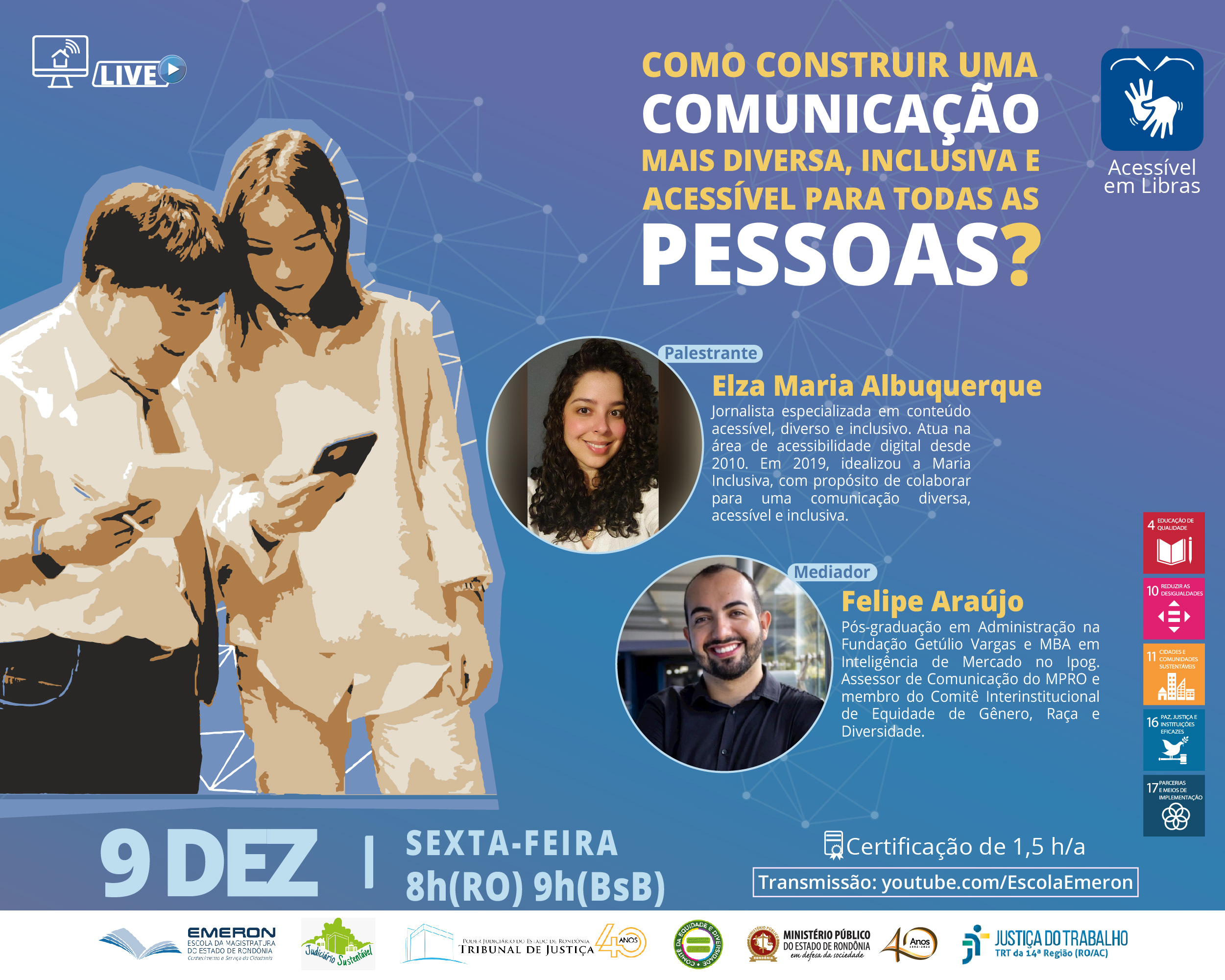 A Escola da Magistratura do Estado de Rondônia (Emeron) realiza nesta sexta-feira, 9 de dezembro, a Live “Como construir uma comunicação mais diversa, inclusiva e acessível para todas as pessoas?”, dentro da programação da Semana da Acessibilidade e Valorização da Pessoa com Deficiência.