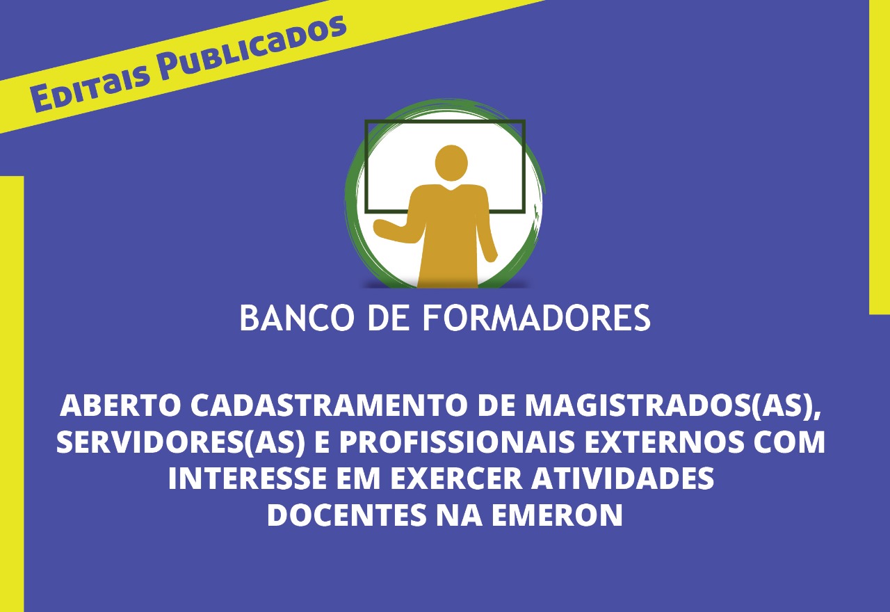 O Banco de Formadores passa a ser a fonte prioritária de consulta e identificação de instrutores(as) para atuação em ações educacionais no âmbito da Emeron, conforme a oportunidade e conveniência administrativa apresentada. De acordo com o edital para profissionais externos, são requisitos mínimos para o cadastramento no Banco de Formadores a formação acadêmica de nível superior completa, domínio sobre tema de interesse do Poder Judiciário de Rondônia e atuação docente alinhada às diretrizes pedagógicas da Emeron e da Escola Nacional de Formação e Aperfeiçoamento de Magistrados (Enfam).