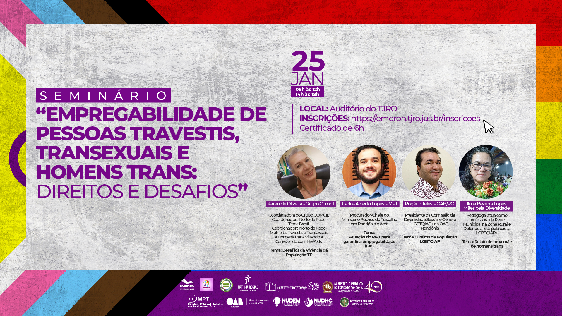 O Comitê Interinstitucional de Equidade de Gênero, Raça e Diversidade, composto pelo Tribunal de Justiça de Rondônia, Ministério Público de Rondônia e Tribunal Regional do Trabalho da 14ª Região (RO e AC), realizará no dia 25 de janeiro de 2023, das 8h às 12h e 14h às 18h, o seminário “Empregabilidade de Pessoas Travestis, Transexuais e Homens Trans: Direitos e Desafios”.