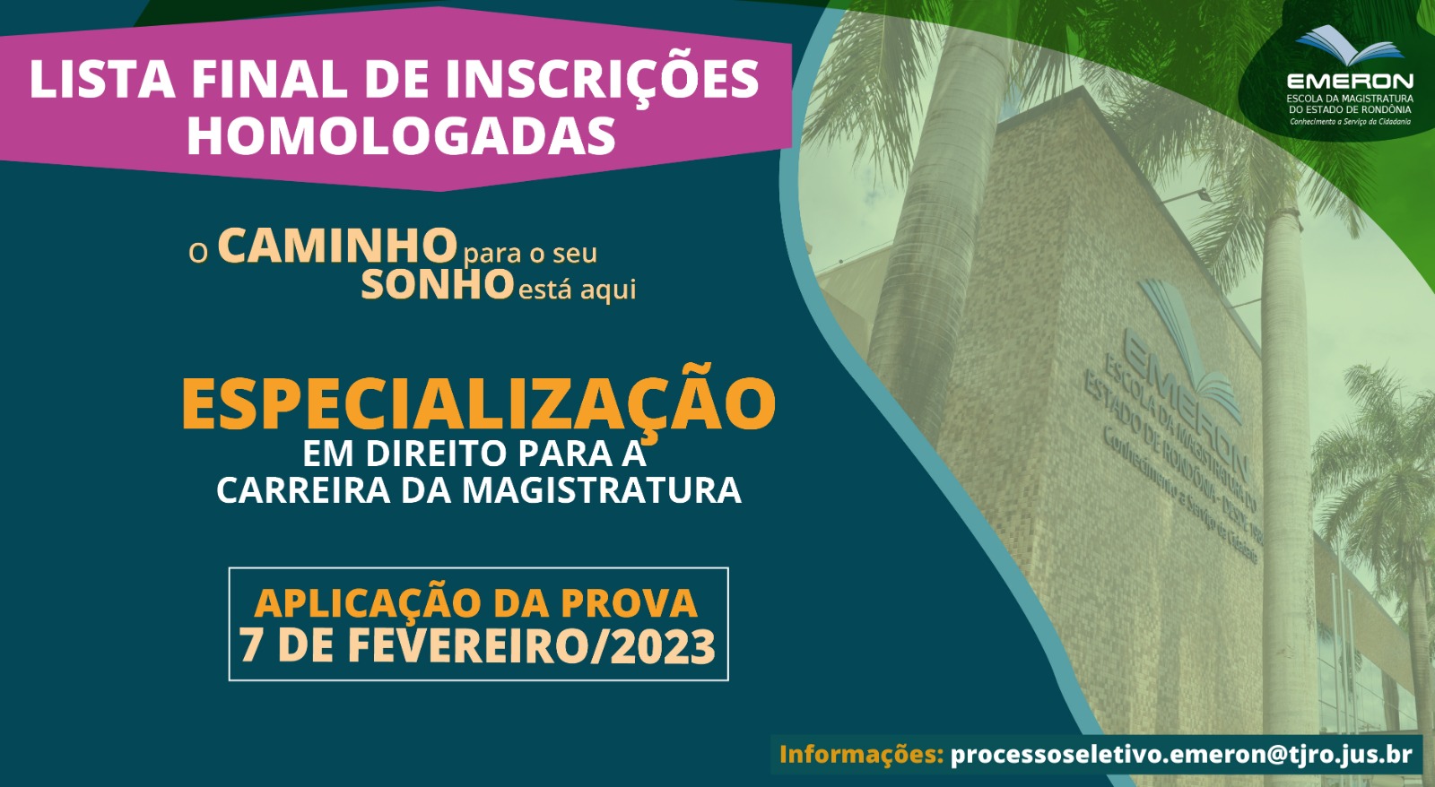 A Escola da Magistratura do Estado de Rondônia (Emeron) informa a lista final de inscrições homologadas para o processo seletivo de 2023 da Especialização em Direito para a Carreira da Magistratura (EDCM), com turmas em Porto Velho e Cacoal.