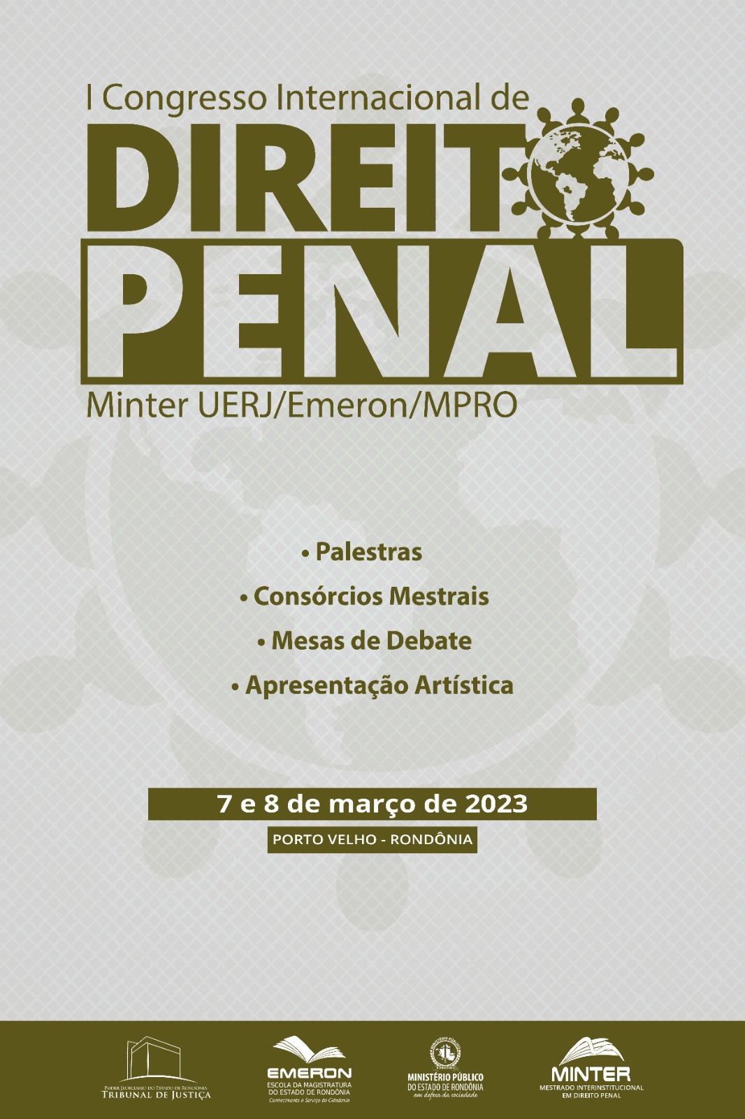 A Escola da Magistratura de Rondônia (Emeron) prorrogou, em razão do feriado de Carnaval, até o próximo dia 21 de fevereiro as inscrições para magistrados(as) e servidores(as) do Tribunal de Justiça do Estado participarem do I Congresso Internacional de Direito Penal do Mestrado Interinstitucional da Universidade do Estado do Rio de Janeiro com a Emeron e Ministério Público de Rondônia. O evento será realizado nos dias 7 e 8 de março, em Porto Velho.