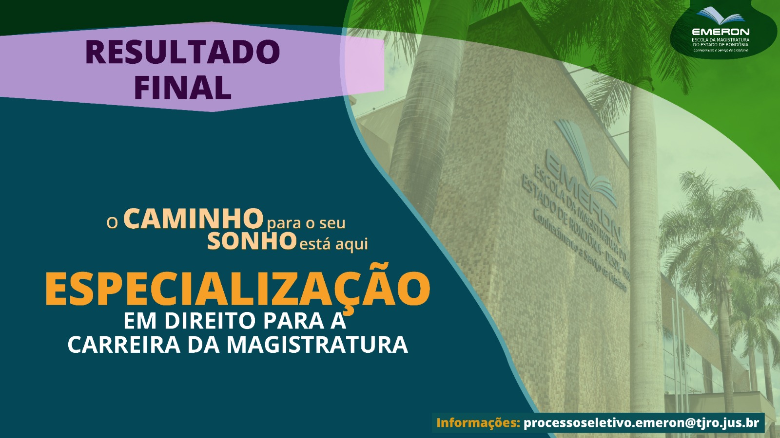 A Escola da Magistratura do Estado de Rondônia (Emeron), em conformidade com o Edital 01/2023 – EMERON, divulga o resultado final do processo seletivo para a Especialização Lato Sensu em Direito para a Carreira da Magistratura (EDCM) 2023, com vagas nas cidades de Porto Velho e Cacoal.