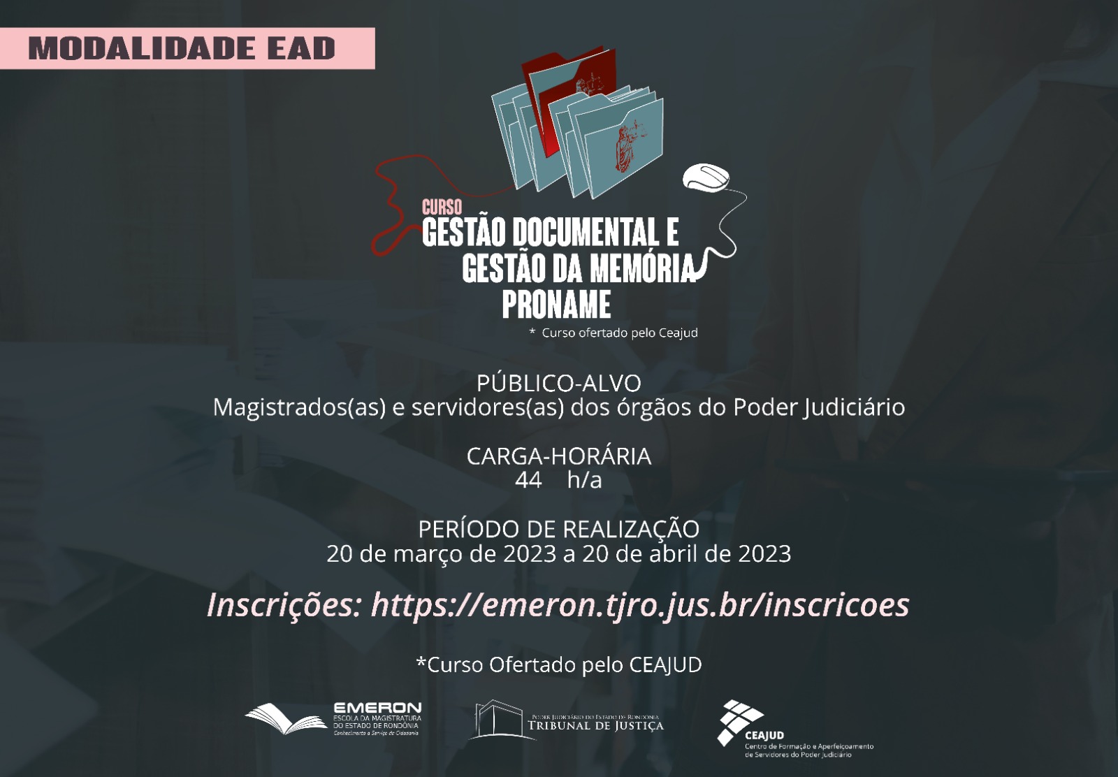 O curso de Gestão Documental e Gestão da Memória, ofertado pelo Conselho Nacional de Justiça (CNJ) e replicado pela Emeron, apresenta ao(à) aluno(a) conteúdo teórico e prático relacionado aos fundamentos constitucionais e legais, princípios, diretrizes e normas do Programa Nacional de Gestão Documental e Memória do Poder Judiciário (Proname) do CNJ, de modo a oferecer instrumentos para a elaboração do planejamento da política aplicável, a implementação e a execução do Programa a todos os ramos da Justiça e respectivos órgãos.