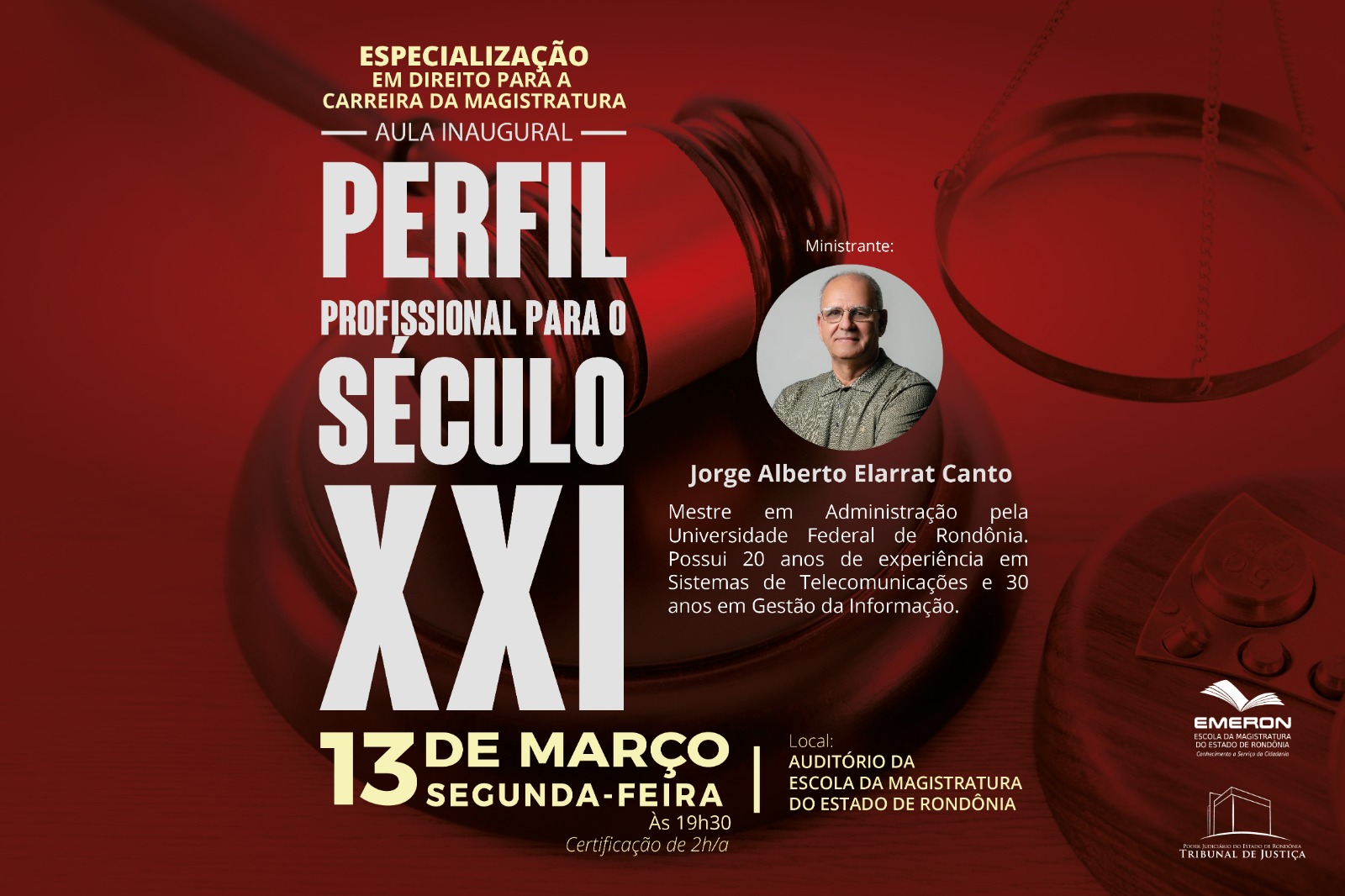 Uma palestra com o tema “Perfil Profissional para o Século XXI” abrirá nesta segunda-feira (13) em Porto Velho as aulas da turma de 2023 da Especialização em Direito para a Carreira da Magistratura (EDCM), ofertada pela Escola da Magistratura do Estado de Rondônia (Emeron).