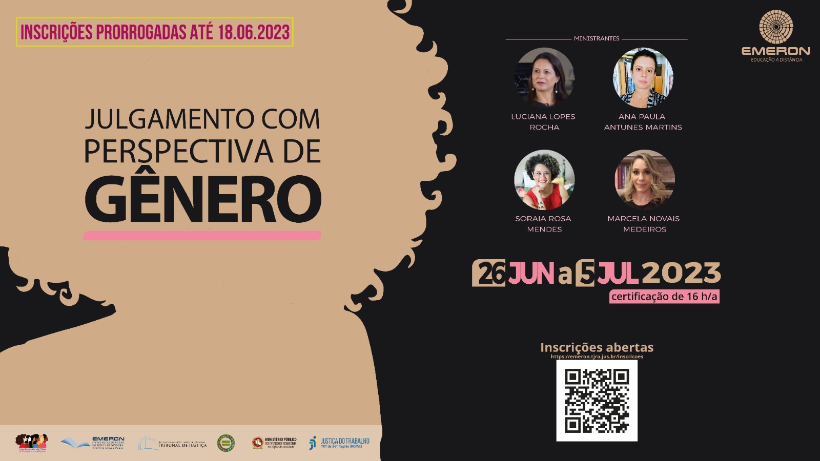 A Escola da Magistratura de Rondônia (Emeron) prorrogou, até o próximo domingo (18), as inscrições para o curso “Julgamento com Perspectiva de Gênero”, que acontecerá na modalidade EaD, no período de 26 de junho a 5 de julho de 2023. A ação é idealizada pela Coordenadoria da Mulher do Tribunal de Justiça do Estado e o Comitê Gestor da Política Interinstitucional de Equidade de Gênero, Raça e Diversidade, composto pelo TJRO, Ministério Público de Rondônia e Tribunal Regional do Trabalho da 14ª Região (RO/AC).