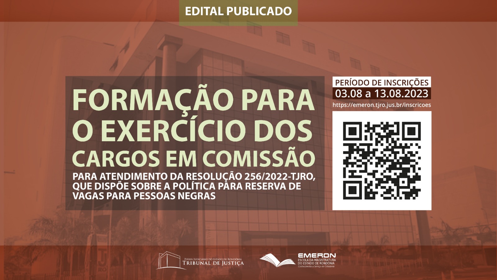 Foi publicado na edição desta quinta-feira (3) do Diário da Justiça Eletrônico o edital 8/2023 EMERON, que trata da formação para o exercício de cargos em comissão por pessoas autodeclaradas pretas ou pardas, em atendimento à Resolução 256/2022-TJRO. A formação será oferecida pela Escola da Magistratura do Estado de Rondônia (Emeron), entre os meses de agosto e outubro de 2023.
