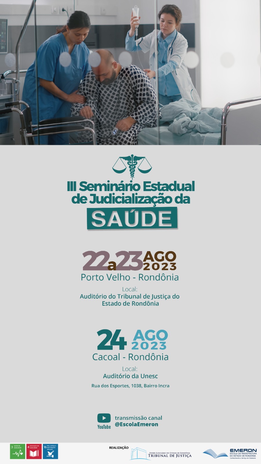 Estão abertas as inscrições do III Seminário Estadual de Judicialização da Saúde, voltadas ao público em geral. O evento acontecerá nas cidades de Porto Velho (22 e 23 de agosto) e Cacoal (24 de agosto), organizado pela Escola da Magistratura de Rondônia (Emeron).