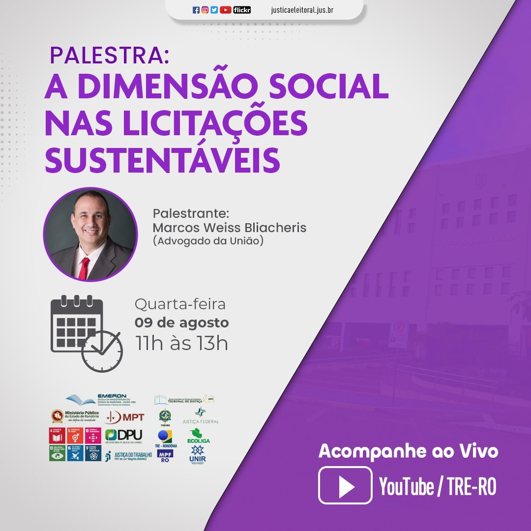 O Tribunal Regional Eleitoral de Rondônia (TRE-RO) realizará, nesta quarta-feira (9), a Palestra “A Dimensão Social nas Licitações Sustentáveis”, das 11h às 13h (horário de RO), visando estimular o aumento de contratações compartilhadas e sustentáveis, tanto pelo TRE-RO quantos pelos demais órgãos que fazem parte da Ecoliga.