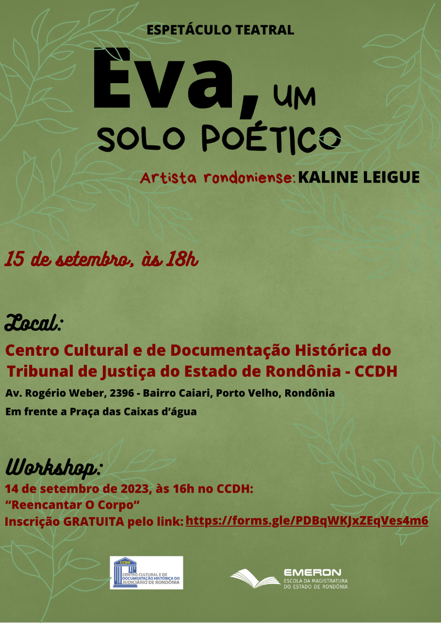 O Centro Cultural e de Documentação Histórica do Tribunal de Justiça de Rondônia (CCDH), vinculado à Escola da Magistratura do Estado (Emeron), promoverá a apresentação do espetáculo teatral “Eva, um Solo Poético”, da artista rondoniense Kaline Leigue, no dia 15, próxima sexta-feira, às 18h, em seu auditório.