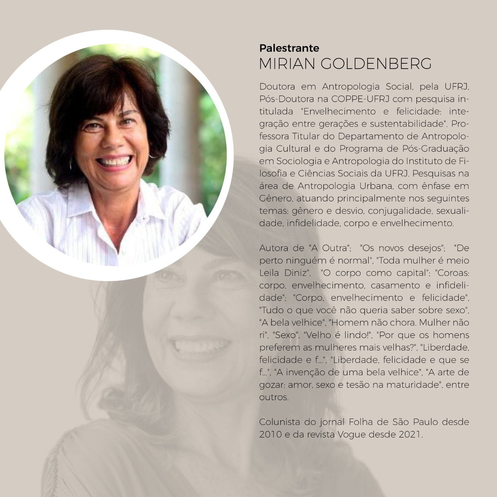 A ministrante será a doutora em Antropologia Social e professora titular do Departamento de Antropologia Cultural e do Programa de Pós-Graduação em Sociologia e Antropologia do Instituto de Filosofia e Ciências Sociais da Universidade Federal do Rio de Janeiro (UFRJ), Mirian Goldenberg.