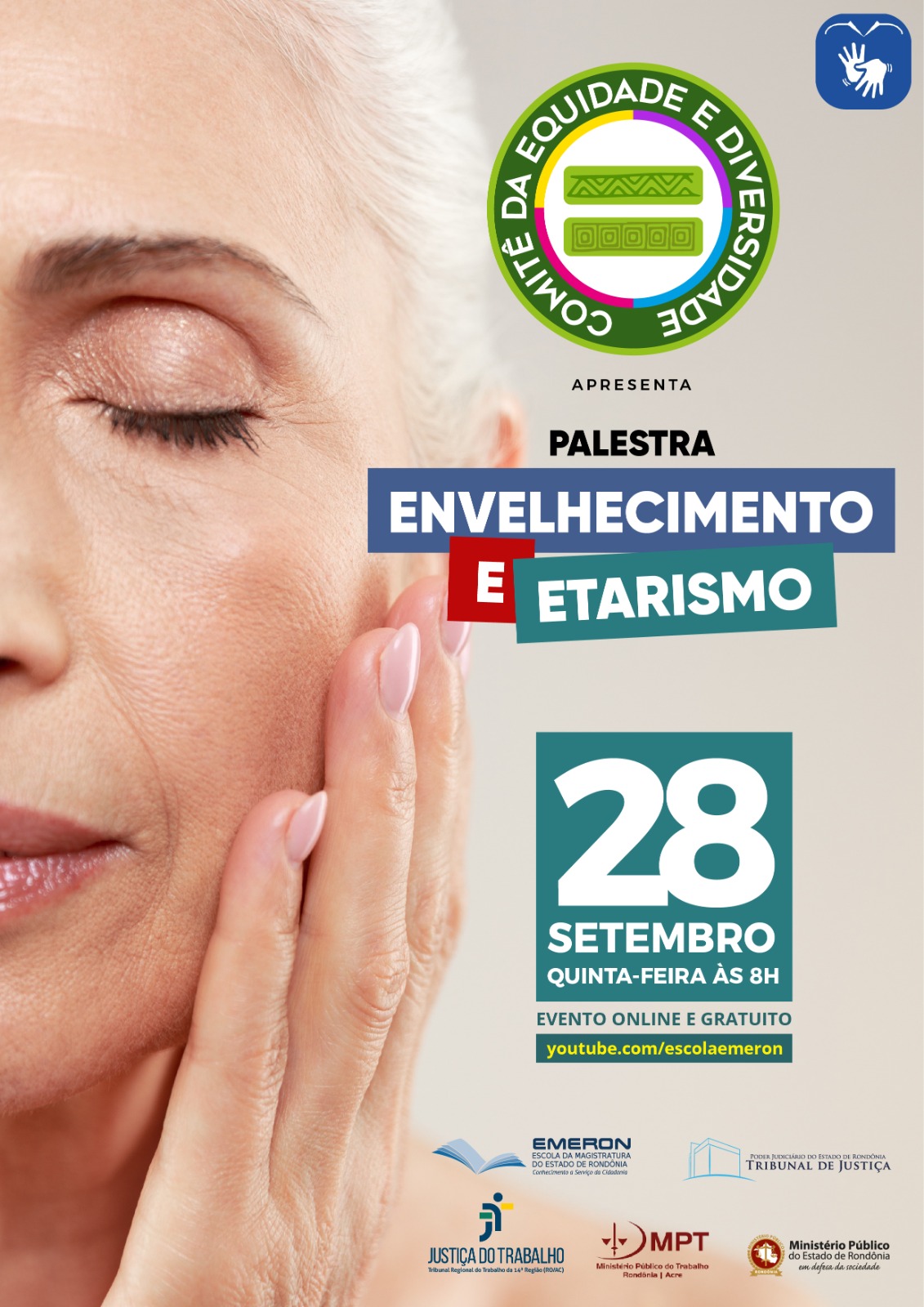 Já estão abertas as inscrições para participação do público em geral na palestra “Envelhecimento e Etarismo”, que acontecerá no dia 28 de setembro, às 8h25, no formato virtual, por meio do canal de YouTube da Escola da Magistratura do Estado de Rondônia (Emeron). Servidores(as) e membros(as) dos órgãos que compõem o Comitê Gestor da Política Interinstitucional de Equidade de Gênero, Raça e Diversidade também podem se inscrever pelo mesmo link.