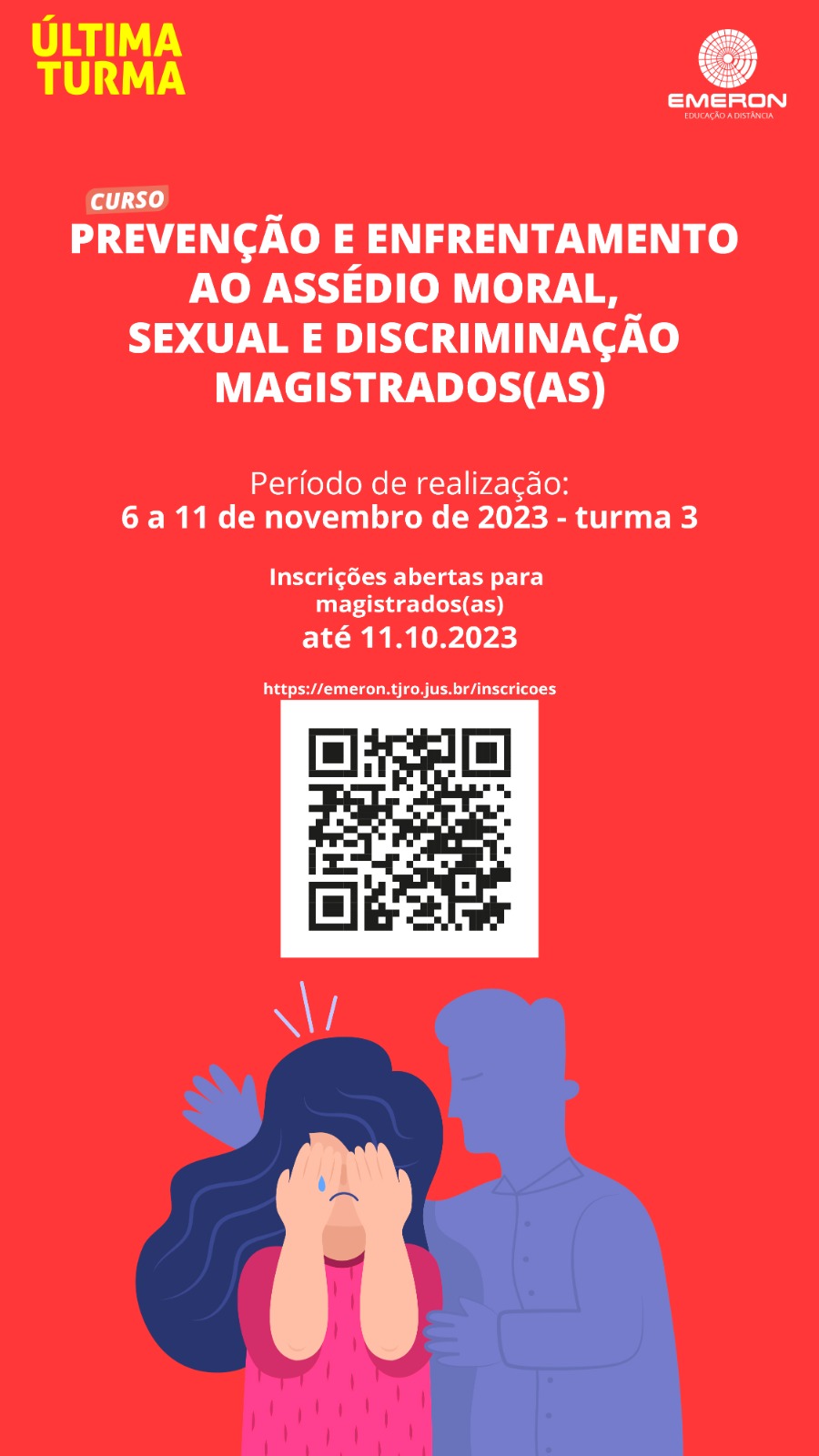 Estão abertas as inscrições para a terceira e última turma do curso “Prevenção e Enfrentamento ao Assédio Moral, Sexual e Discriminação”, voltado a magistradas e magistrados. Promovida pela Escola da Magistratura do Estado de Rondônia (Emeron), a formação novamente acontecerá na modalidade EaD, com carga horária de 5 horas-aula.