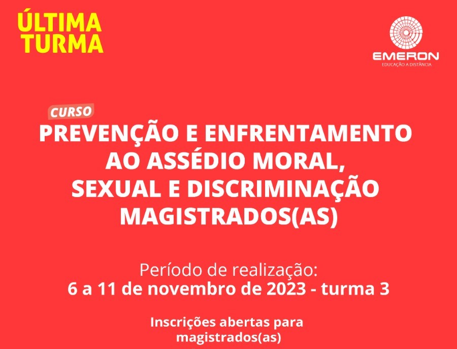 A Escola da Magistratura do Estado de Rondônia (Emeron) prorrogou as inscrições para participação de magistrados(as) na terceira e última turma do curso “Prevenção e Enfrentamento ao Assédio Moral, Sexual e Discriminação”. Agora, os(as) interessados(as) têm até a próxima segunda-feira (16) para se inscrever na formação, que acontecerá na modalidade EaD, com carga horária de 5 horas-aula.