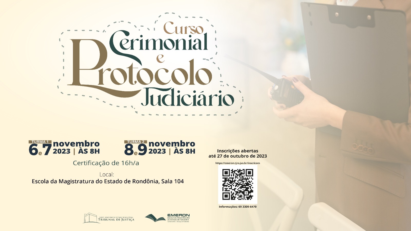 A Escola da Magistratura de Rondônia (Emeron) abriu inscrições para servidores interessados em participar do curso Cerimonial e Protocolo Judiciário, que acontecerá presencialmente em Porto Velho, em duas turmas, no mês de novembro.