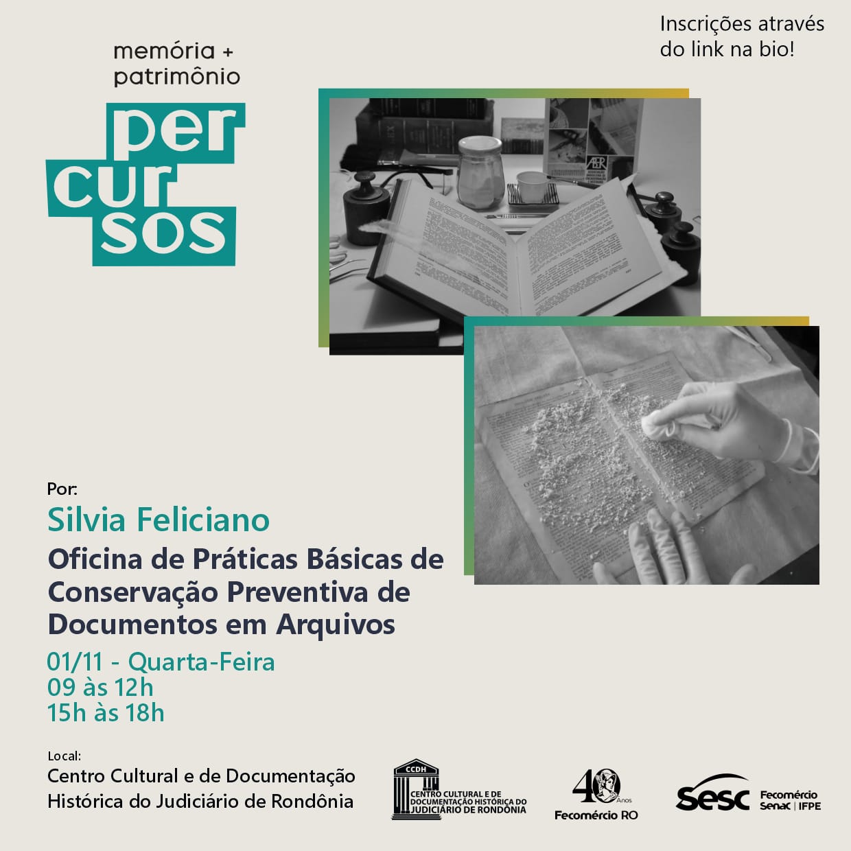O Centro Cultural e de Documentação Histórica do Judiciário de Rondônia (CCDH), vinculado à Escola da Magistratura do Estado (Emeron), receberá em seu auditório a Oficina de Práticas Básicas de Conservação Preventiva de Documentos em Arquivos, com a artista plástica Silvia Feliciano, no dia 1º de novembro (quarta-feira), das 9h às 12h e das 15h às 18h. A oficina tem como objetivo identificar as práticas utilizadas na conservação preventiva dos acervos, demonstrar seu significado, a diferença com a restauração e o que deve ser feito para preservar os documentos.