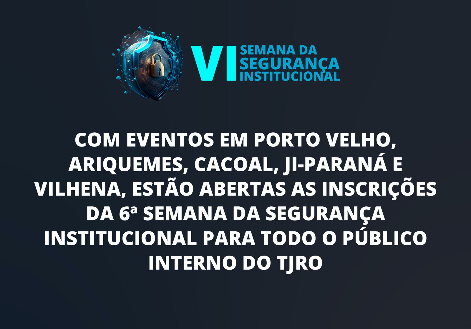 As inscrições a todo o público interno para a VI Semana da Segurança Institucional do Tribunal de Justiça de Rondônia estão abertas até o próximo dia 19 de novembro, no site da Escola da Magistratura do Estado (emeron.tjro.jus.br/inscricoes). O evento acontecerá presencialmente de 20 a 24 de novembro, em Porto Velho e nas comarcas de Ariquemes, Cacoal, Ji-Paraná e Vilhena, sendo um dia em cada cidade.