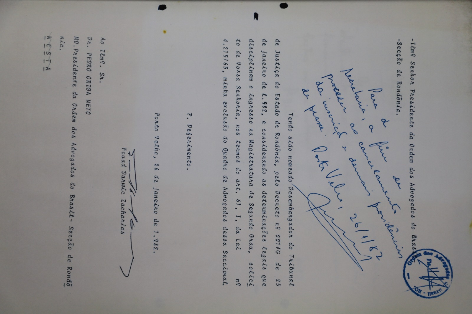 Há ainda uma certidão do ano 2000, com a informação de que Fouad foi inscrito na OAB Pará em 18/02/1948 e em Rondônia, em 28/11/1975, nunca tendo sofrido qualquer imposição disciplinar. Também registra a assinatura dele na ata de fundação da OAB/RO, de 18/02/1974, com passagem pelo cargo de presidente entre 1974 e 1975. As informações vieram em resposta a uma solicitação da sra. Edna Grangeiro Darwich, viúva de Fouad.