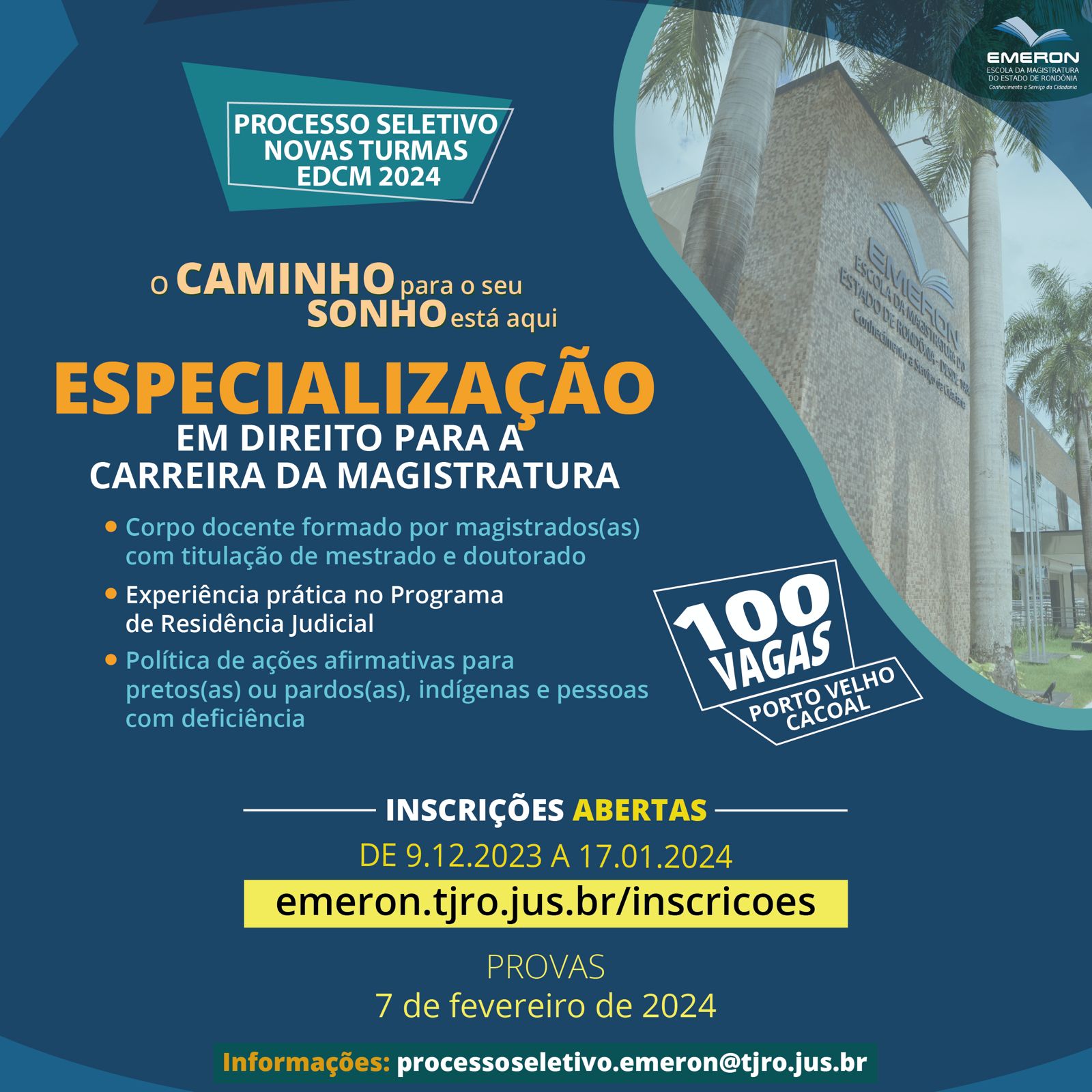 A Escola da Magistratura de Rondônia (Emeron) publicou, no Diário Eletrônico da Justiça Estadual desta sexta-feira (8), o Edital 14/2023, que trata do processo seletivo para ingresso na Turma 2024 da Especialização em Direito para a Carreira da Magistratura (EDCM), em Porto Velho e Cacoal. O curso de pós-graduação lato sensu destina-se a portadores(as) de diploma de graduação em Direito e conta com Política de Ações Afirmativas, com reserva de vagas para grupos minorizados e gratuidade nas inscrições e mensalidades.