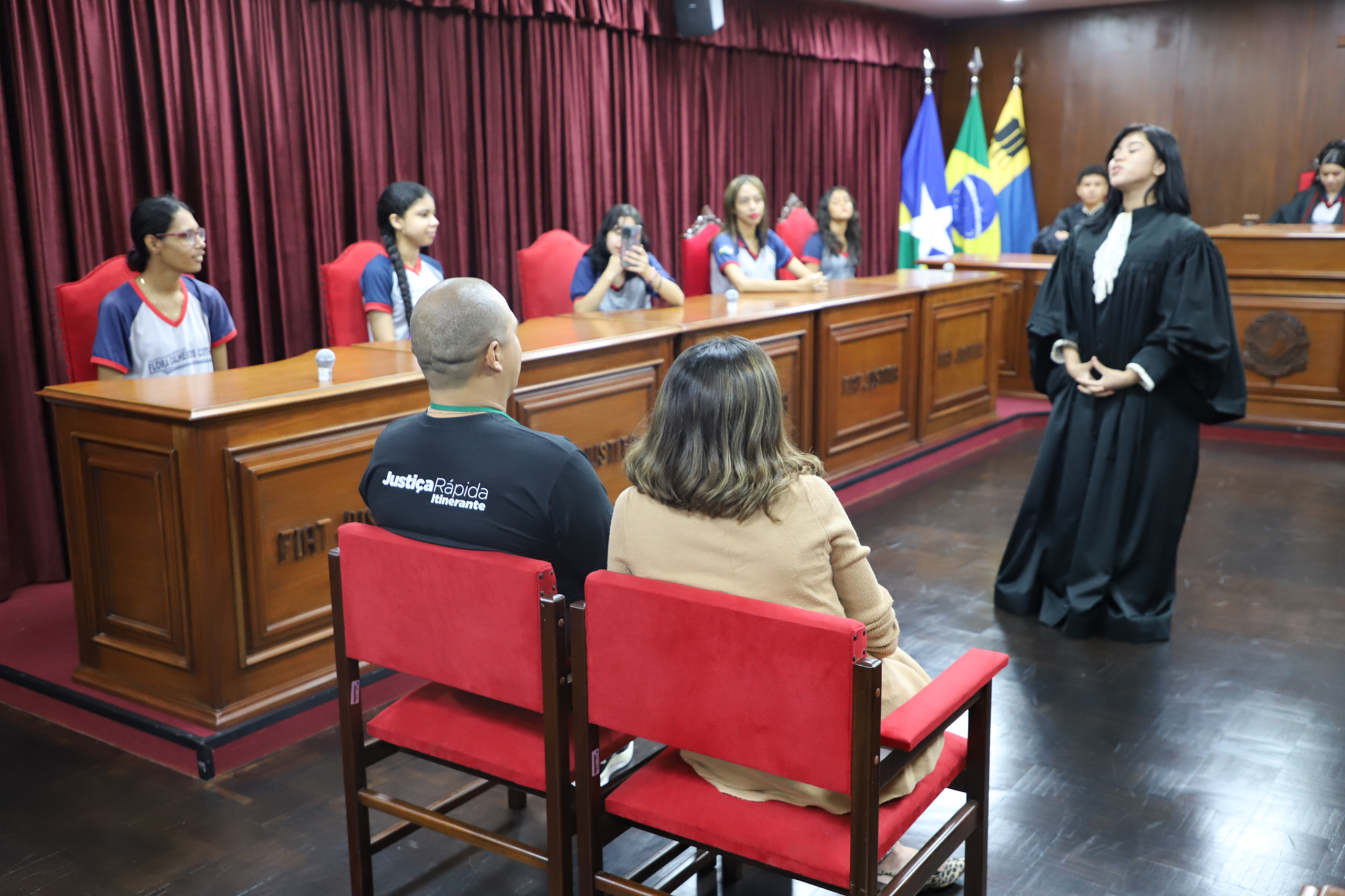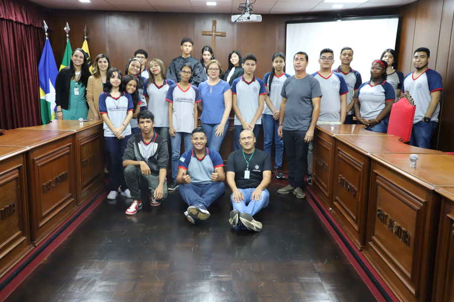 A experiência começou na Emeron, onde os estudantes exploraram o primeiro Pleno do TJRO e foram convidados a participar de uma encenação do Tribunal do Júri, desempenhando os papéis de juiz, promotor, advogado e demais membros da corte em um julgamento simulado.