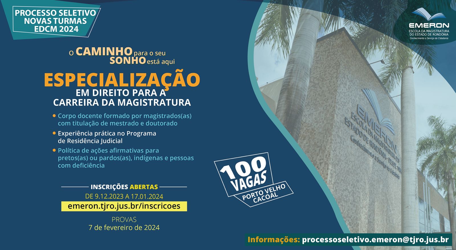 Continuam abertas até o dia 17 de janeiro de 2024, as inscrições para a Especialização em Direito para a Carreira da Magistratura (EDCM), realizada pela Escola da Magistratura de Rondônia (Emeron) nas cidades de Porto Velho e Cacoal.