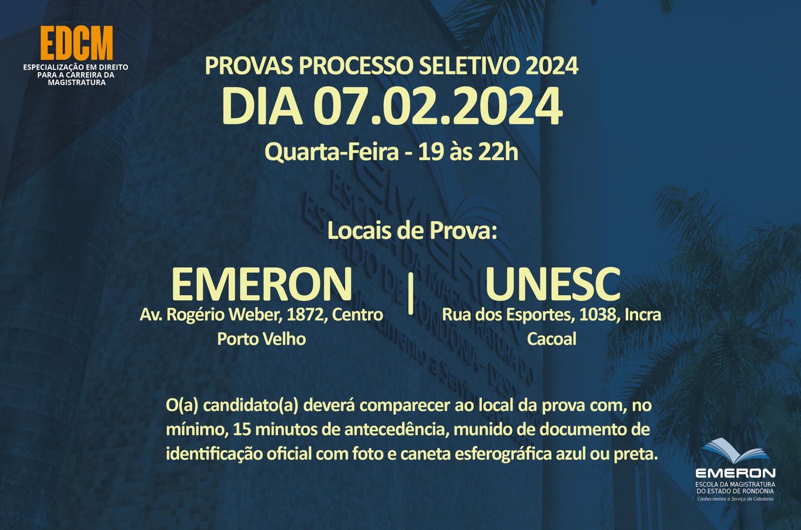 A Escola da Magistratura do Estado de Rondônia (Emeron) realiza nesta quarta-feira, 7 de fevereiro, a aplicação das provas do processo seletivo para a turma de 2024 da Especialização em Direito para a Carreira da Magistratura (EDCM).