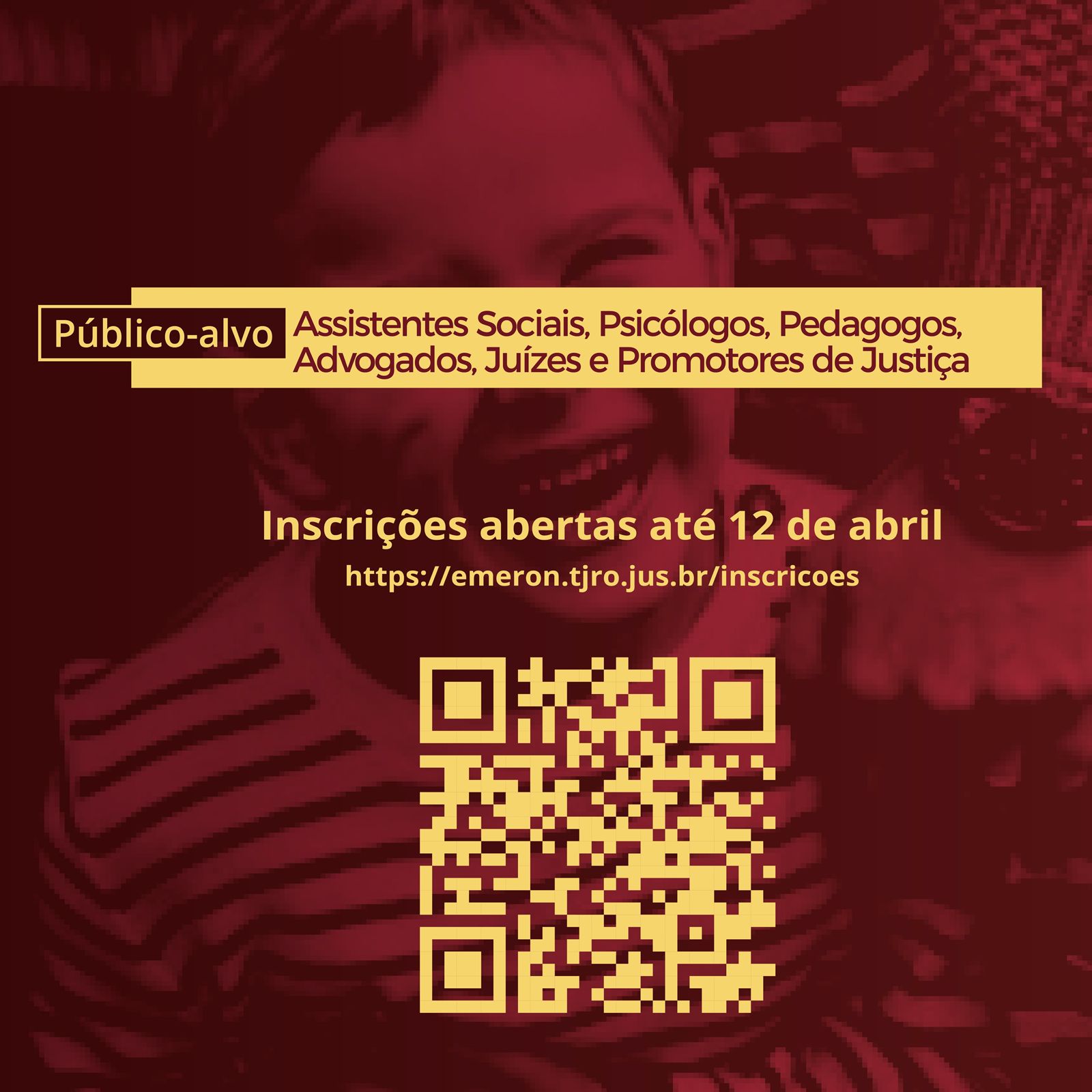 Como parte da programação da 5ª Semana do Direito à Convivência Familiar e Comunitária, a Escola da Magistratura de Rondônia (Emeron) abriu inscrições para participação do público externo no Seminário “Direito e Convivência Familiar de Crianças e Adolescentes”. O evento acontecerá no dia 19 de abril, das 8h às 14h, no auditório do Fórum Geral Desembargador César Montenegro (Av. Pinheiro Machado, 777, Olaria).