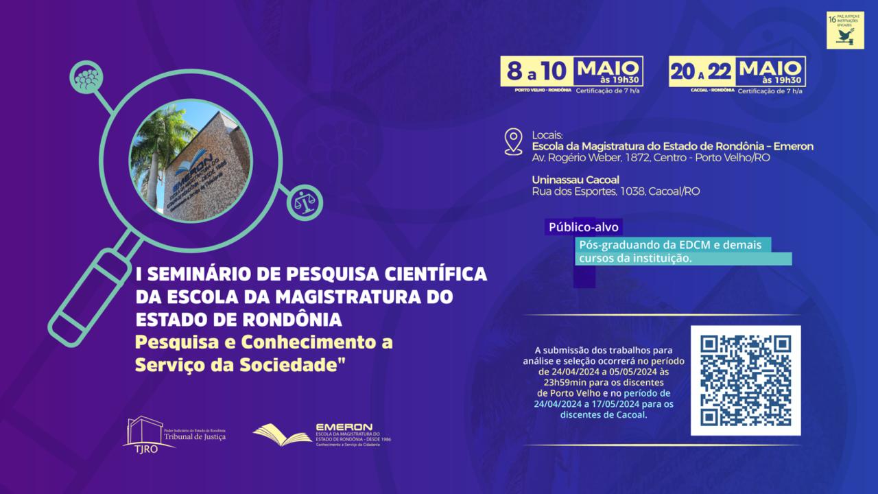 A Escola da Magistratura do Estado de Rondônia (Emeron) promove, em maio, o I Seminário de Pesquisa Científica da Especialização Lato Sensu em Direito para a Carreira da Magistratura (EDCM), nas cidades de Porto Velho e Cacoal. O evento será realizado na modalidade presencial, na sede da Emeron na capital, de 8 a 10 de maio, e em Cacoal, no auditório da Uninassau, de 20 a 22 de maio.
