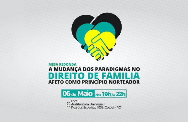 Escola da Magistratura do Estado de Rondônia (Emeron) em parceria com o Instituto Brasileiro de Direito de Família - IBDFAM, seção Rondônia, realizará em Cacoal a Mesa Redonda "A Mudança dos Paradigmas no Direito das Famílias: Afeto como Princípio Norteador". O evento gratuito será no próximo dia 6 de maio (segunda-feira), na Faculdade Uninassau (Rua dos Esportes, 1038, antiga Unesc).