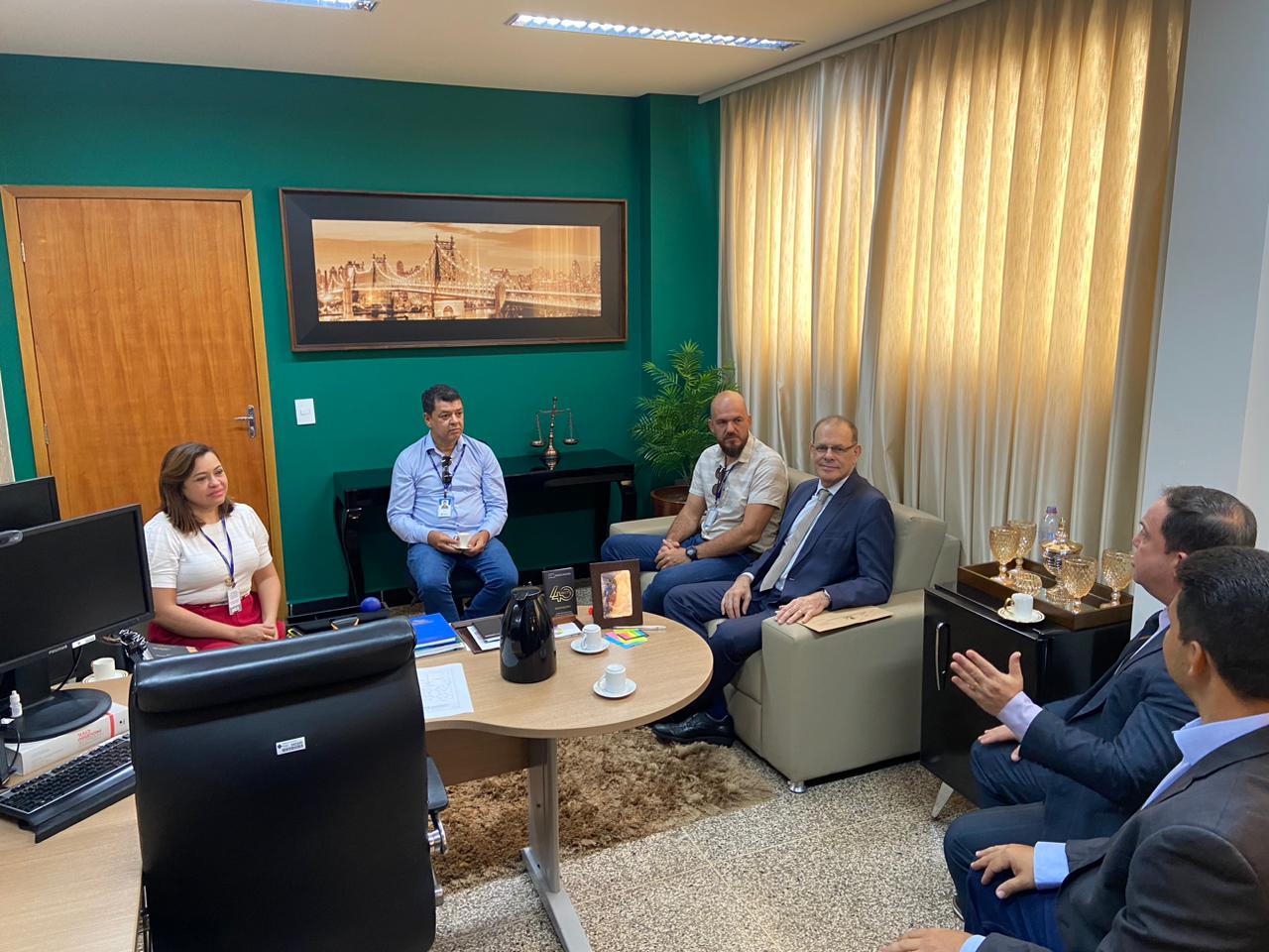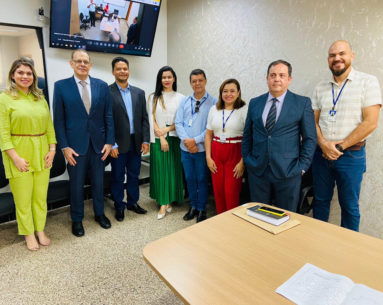 O primeiro compromisso na cidade foi uma reunião com o coordenador do Nuped, juiz Elson Pereira de Oliveira Bastos, e a equipe de servidores do Núcleo. A juíza Márcia Freitas, professora da EDCM, também participou.