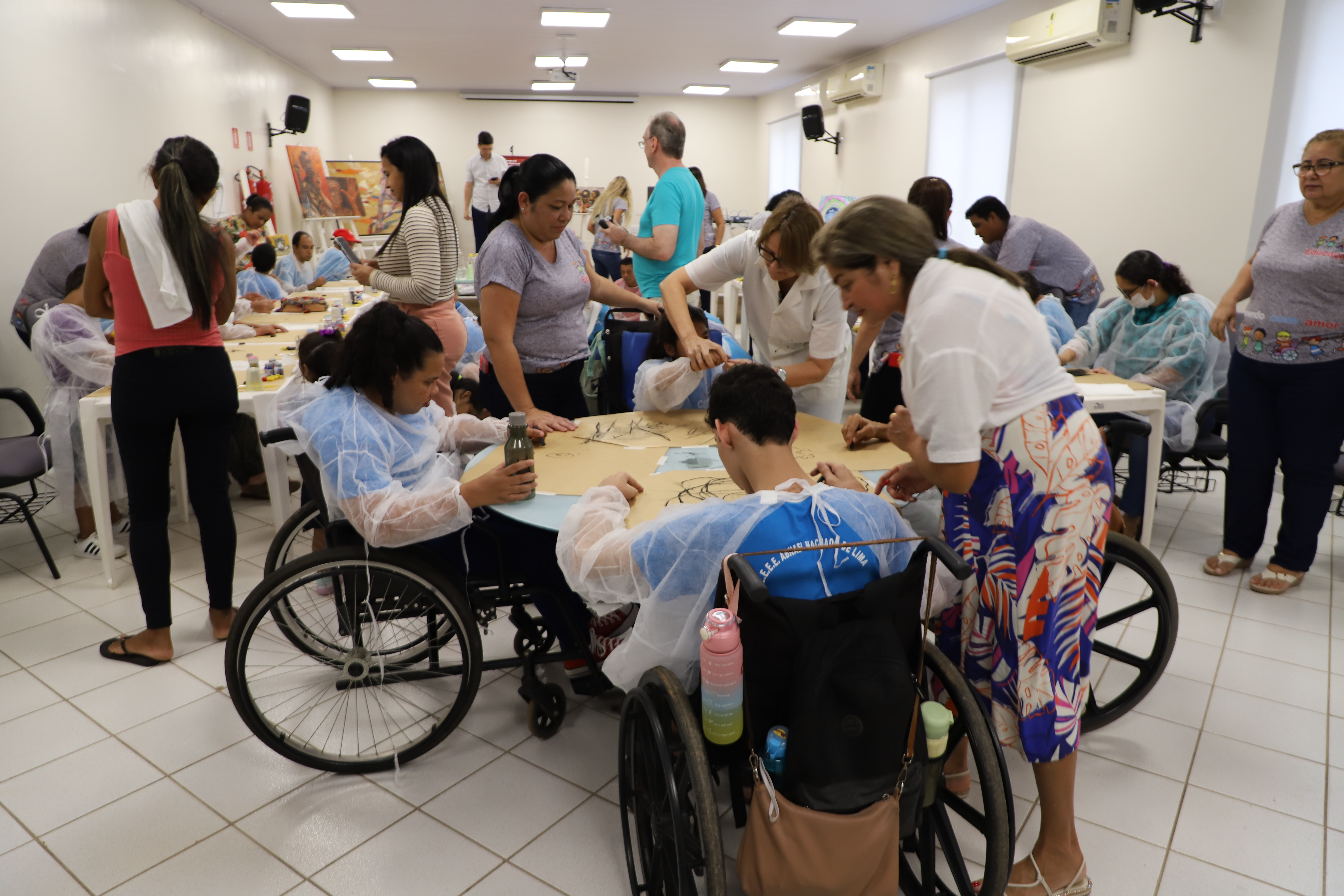 O último dia de oficina, com 31 estudantes da Escola Especial Abnael Machado acompanhados por oito professores(as), oito cuidadores, psicólogo e gestora da escola, encheu o auditório do CCDH com muita alegria e aprendizado. “Foi uma experiência e vivência enriquecedora, diferenciada do nosso cotidiano, tanto para os(as) alunos(as) quanto aos profissionais da escola, pois os(as) estudantes começaram a se preparar um dia antes para nos deslocarmos do ambiente escolar”, contou Claudiovane Lacerda, professora de Oficina de Artes da escola. “Quem trabalha com alunos(as) com deficiências sabe que, quando há uma atividade diferenciada, até o momento da saída ninguém tem descanso. Os(as) estudantes começam a entrar em estado de ansiedade e ficam pensando: como será o evento? Vai ter lanche? Com que roupa eu vou? Preciso falar com minha mãe!”