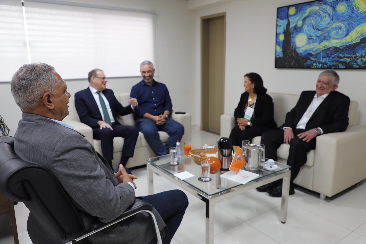 O Diretor da Emeron recebeu na sequência Horácio Batista Guedes, presidente do Conselho Estadual de Educação de Rondônia (CEE/RO), Agenor Fernandes, vice-presidente do CEE, a presidente do Conselho Estadual de Educação do Acre (CEE/AC) Elisete Machado e Ricardo Tonassi, presidente do Fórum Nacional dos Conselhos Estaduais e Distrital de Educação (Foncede). Durante o encontro, realizado durante a Reunião Plenária da Região Norte do Foncede que acontece esta semana na Emeron, foram discutidas diversas pautas relacionadas ao desenvolvimento e aprimoramento das políticas educacionais, bem como a integração e cooperação entre os conselhos estaduais. O momento destacou a importância de um diálogo contínuo e colaborativo para enfrentar os desafios educacionais e promover a qualidade do ensino no país e região.