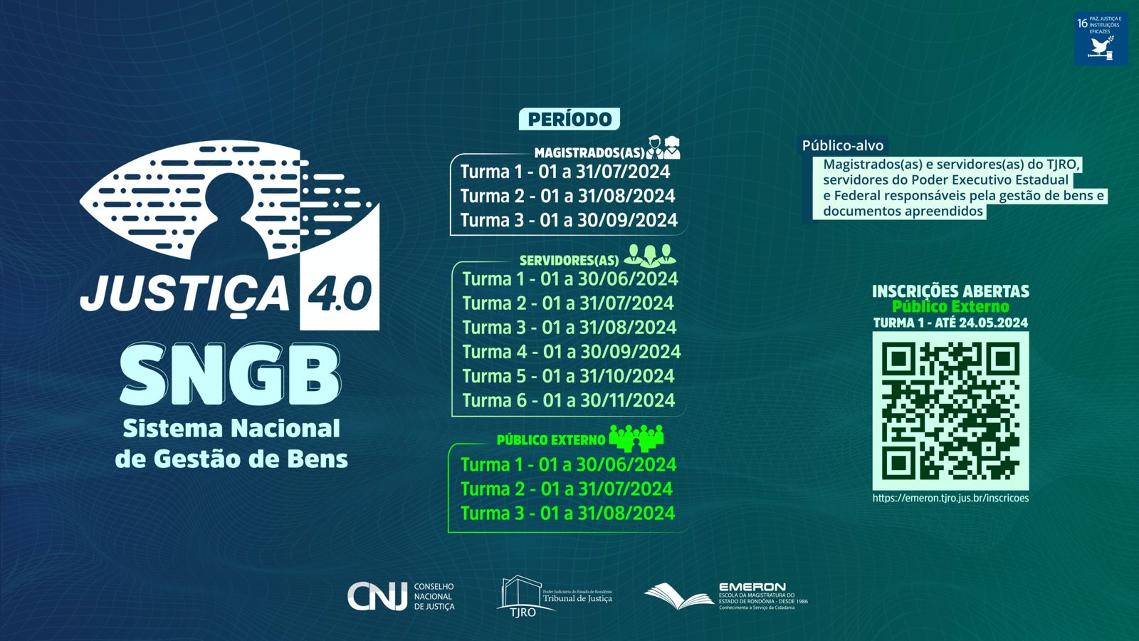 O público externo (especialmente servidores do Poder Executivo responsáveis pela gestão de bens e documentos apreendidos, como integrantes das polícias civil, federal e rodoviária) pode se inscrever por meio de link no site da Emeron (emeron.tjro.jus.br/inscricoes), nos períodos de 20 a 24 de maio de 2024 para a turma 1, de 3 a 7 de junho para a turma 2 e de 8 a 12 de julho para a turma 3.