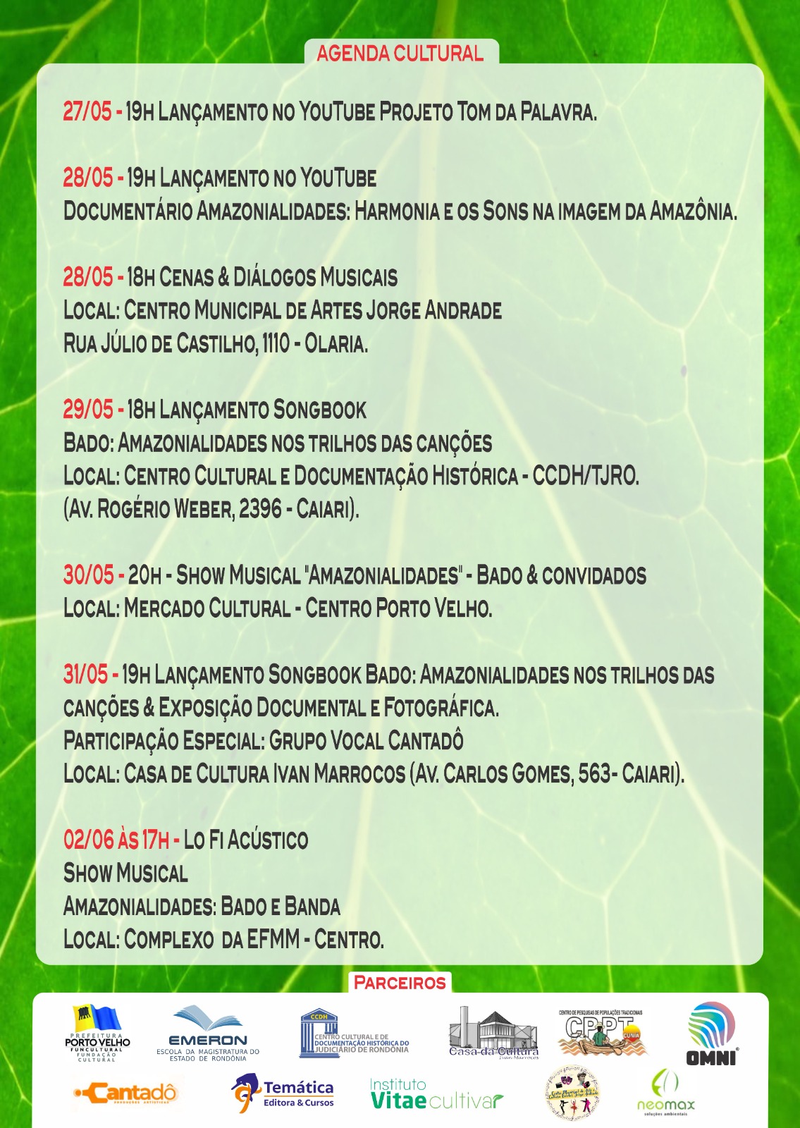 O Centro Cultural e de Documentação Histórica do Judiciário (CCDH), vinculado à Escola da Magistratura de Rondônia (Emeron), apresenta nesta quarta-feira (29), às 18h, o lançamento do songbook (livro impresso com partituras) do artista alternativo rondoniense Bado, intitulado “Amazonialidades nos trilhos das canções”. O evento será no auditório do CCDH, em comemoração aos 40 anos de carreira do músico, e contará com um bate-papo e suas músicas ao longo da carreira.