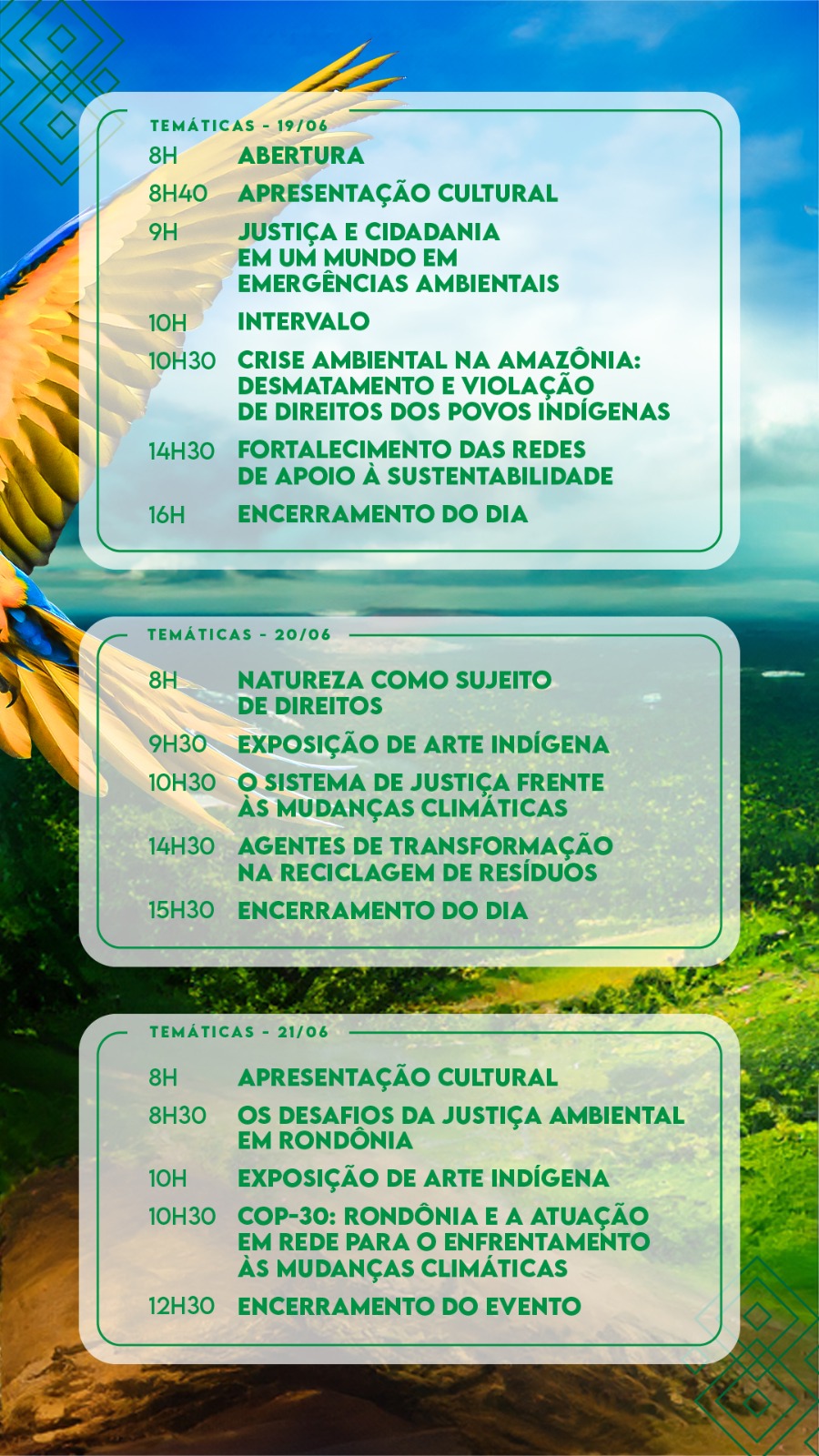A Escola da Magistratura do Estado de Rondônia (Emeron), Tribunal de Justiça (TJRO), Tribunal Regional Eleitoral (TRE/RO), Tribunal de Contas do Estado de Rondônia (TCERO), Tribunal Regional do Trabalho (TRT-14), Ministério Público Estadual (MP-RO), Ministério Público do Trabalho (MPT) e Ministério Público Federal (MPF) promoverão o Seminário “Justiça e Cidadania em um Mundo de Emergências Ambientais”, que ocorrerá de 19 a 21 de junho de 2024, no auditório do Tribunal Regional Eleitoral de Rondônia (TRE/RO). O evento discutirá a ocorrência das mudanças climáticas extremas, suas consequências no bioma amazônico e possíveis soluções/contribuições que as instituições, sociedade civil organizada e indivíduos podem trazer.