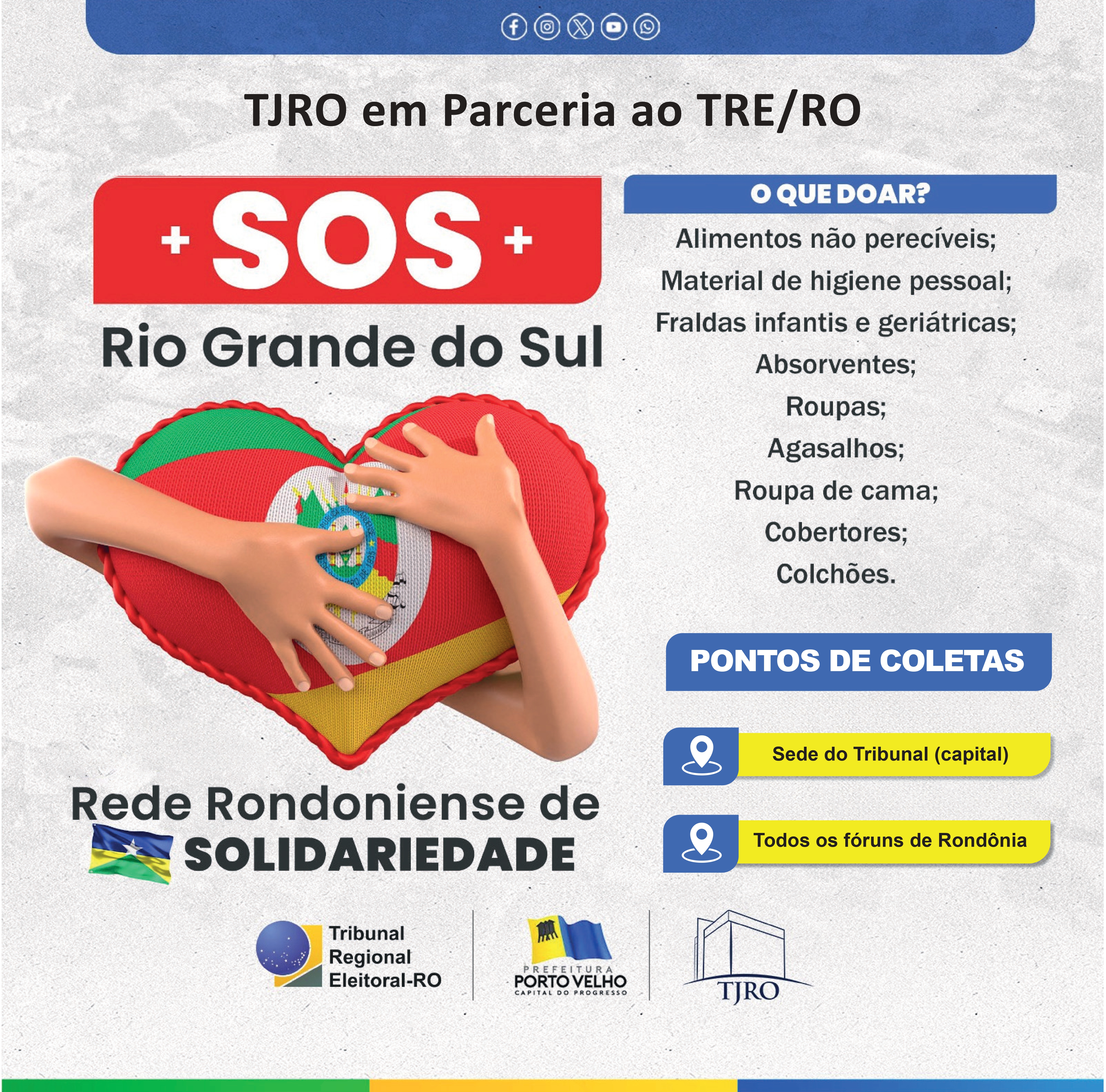 Para facilitar as doações, todas as unidades da Justiça Eleitoral de Rondônia, tanto na capital quanto no interior, estão funcionando como pontos de coleta. Os itens necessários incluem alimentos não perecíveis, itens de higiene pessoal, fraldas infantis e geriátricas, absorventes íntimos, colchões, roupas de cama, cobertores, roupas, agasalhos, calçados e brinquedos.