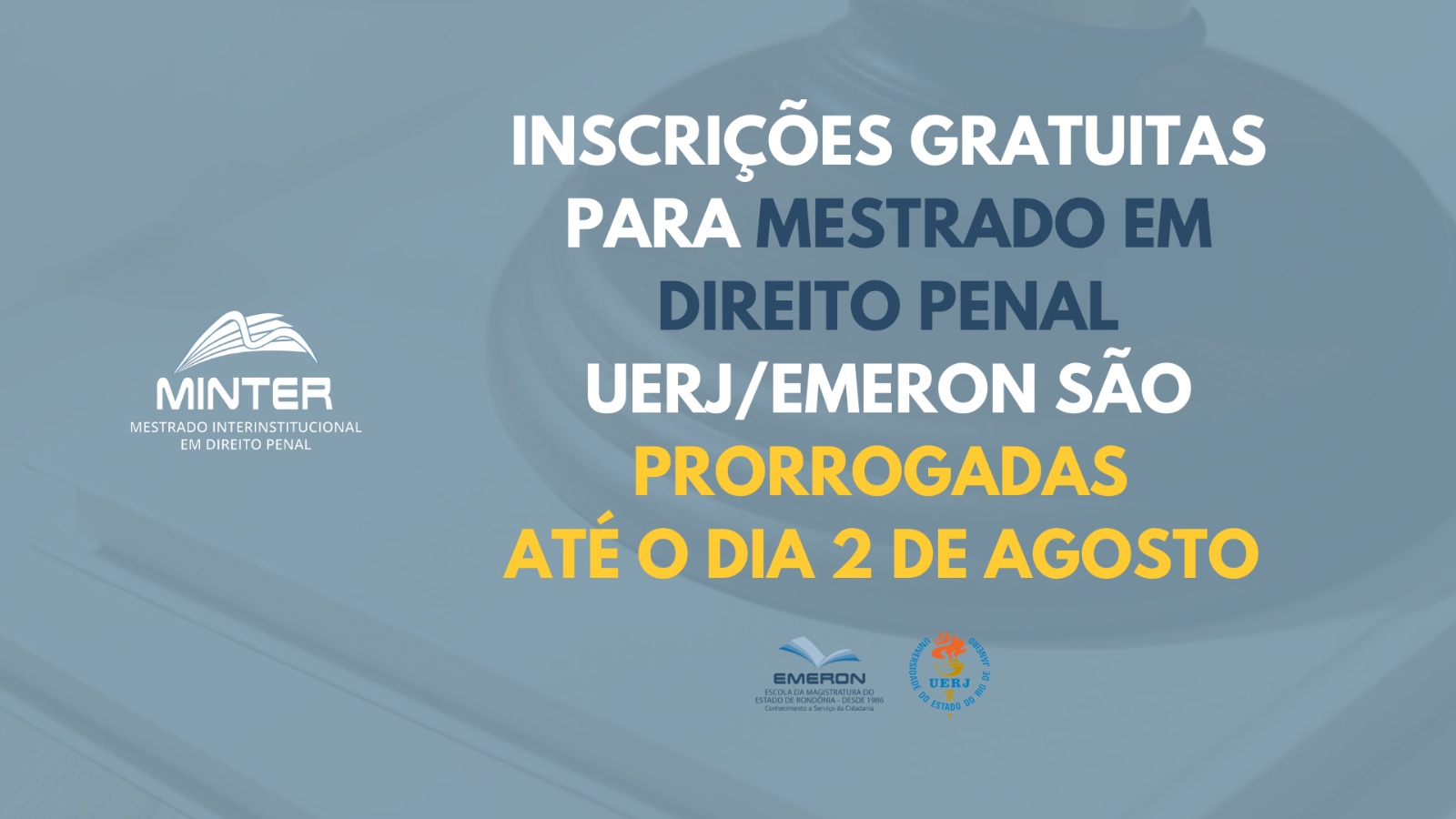 Foi publicado no Diário da Justiça desta terça-feira, 23, o edital de prorrogação das inscrições para a seleção de discentes no curso de Mestrado Interinstitucional (Minter) em Direito Penal da Universidade do Estado do Rio de Janeiro (UERJ), oferecido em parceria com a Escola da Magistratura de Rondônia (Emeron). O novo prazo para envio da inscrição é o dia 2 de agosto de 2024.