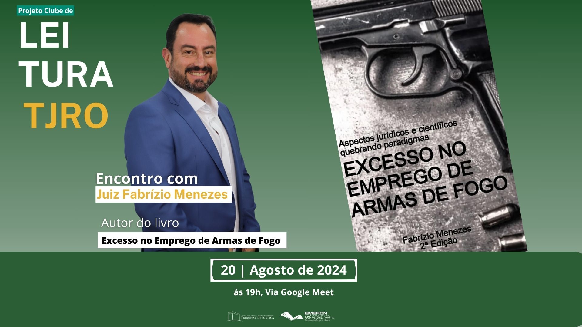 O Clube de Leitura promovido pela Escola da Magistratura de Rondônia (Emeron) e pelo Tribunal de Justiça de Rondônia (TJRO) receberá no próximo dia 20 de agosto, às 19h, o juiz Fabrizio Menezes, autor do livro "Excesso no emprego de armas de fogo", que aborda os aspectos jurídicos e científicos do uso desse instrumento.