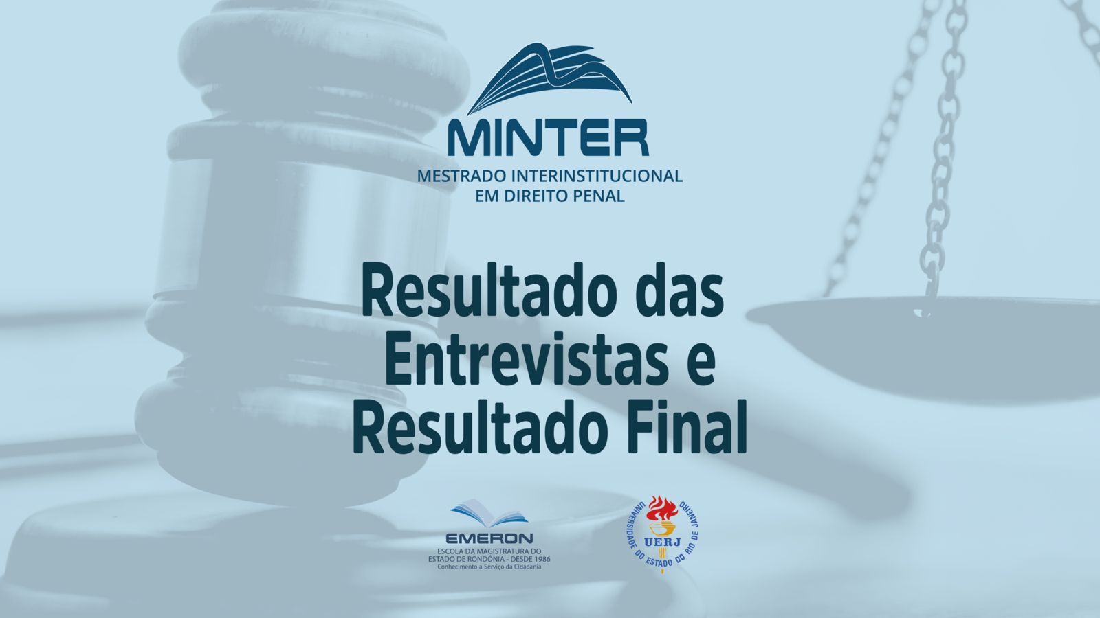 A Escola da Magistratura de Rondônia (Emeron) publica o resultado das entrevistas e o resultado final do processo seletivo para o Mestrado Interinstitucional (Minter) em Direito Penal oferecido pela Universidade do Estado do Rio de Janeiro (UERJ), em parceria com a Emeron.