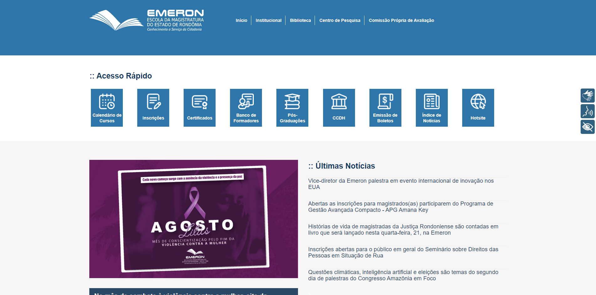 Dedicada principalmente à formação e capacitação de magistrados(as) e servidores(as) do Poder Judiciário de Rondônia, a Emeron oferece uma série de cursos, incluindo formação continuada, pós-graduações lato e strictu sensu e eventos. Com botões mais intuitivos, o novo layout do site facilita o acesso a eventos e serviços online, beneficiando tanto os alunos quanto o público em geral.
