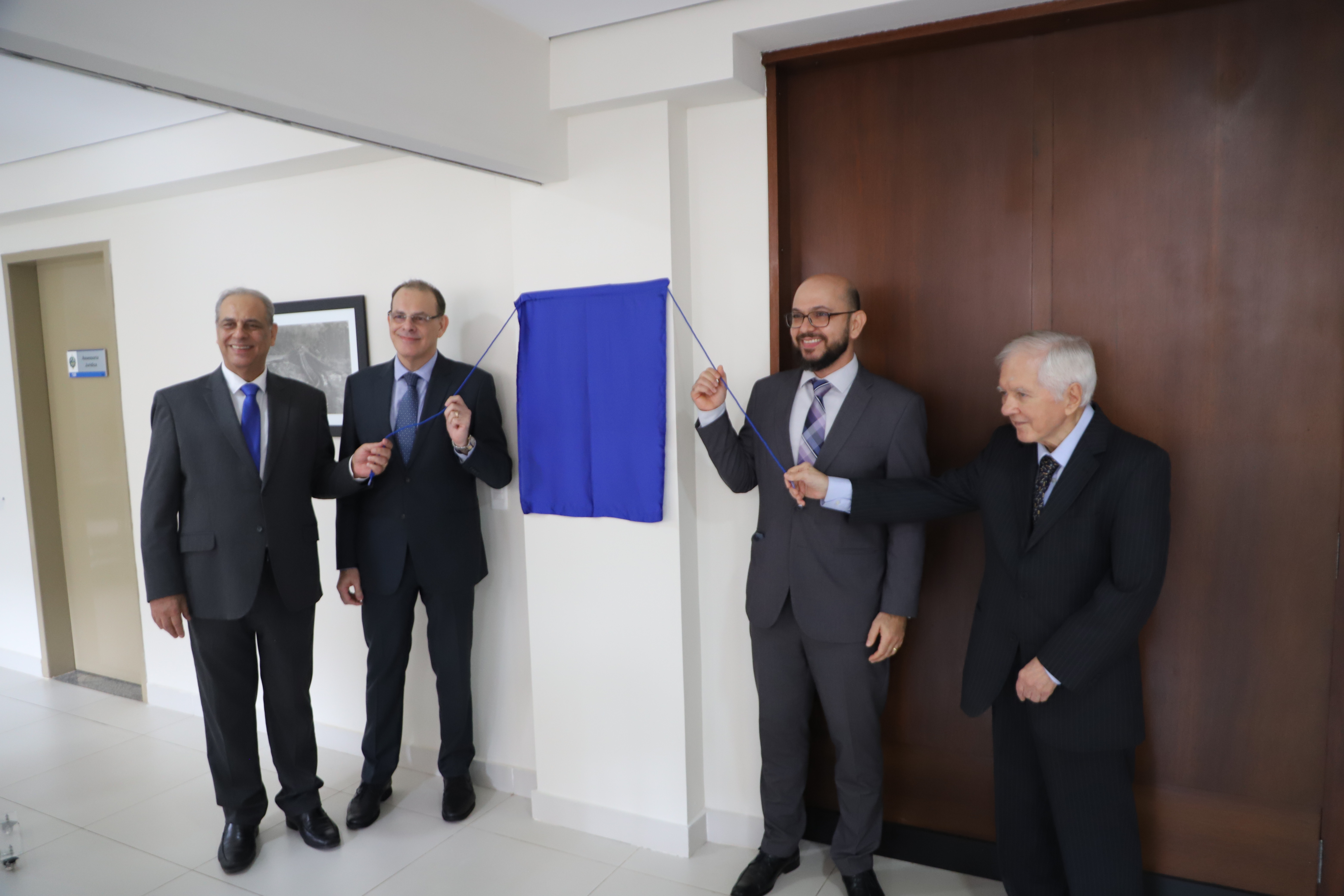Em seguida, o desembargador Alexandre Miguel conduziu a cerimônia de nomeação de três espaços da Escola. O primeiro deles foi o auditório, que passou a ser chamado de Auditório Desembargador Walter Waltenberg Silva Junior, em homenagem ao ex-presidente do TJRO, falecido em 2021. A companheira de Walter, Silvinha, esteve presente e, ao lado de Alexandre Miguel, realizou o descerramento da placa na entrada do espaço, contendo uma pequena biografia do homenageado.
