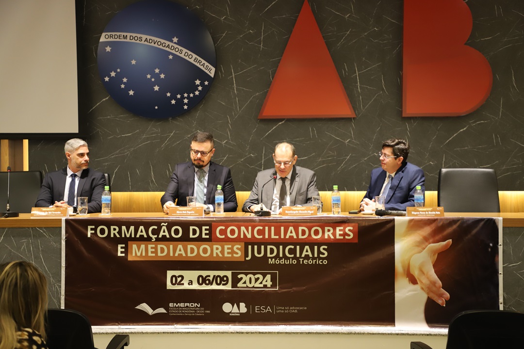 O Diretor da Escola da Magistratura do Estado de Rondônia (Emeron), desembargador Alexandre Miguel, esteve em Cacoal na última semana para a abertura da Formação de Conciliadores e Mediadores Judiciais - Turma OAB Cacoal. Estiveram presentes na mesa de abertura, junto ao desembargador Alexandre, o Presidente da Ordem dos Advogados do Brasil - Seccional Rondônia, Márcio Melo Nogueira, o Coordenador do Núcleo Pedagógico da Emeron na cidade, juiz Elson Pereira de Oliveira Bastos, e o Presidente da OAB - Subseção de Cacoal, Diógenes Nunes de Almeida Neto.