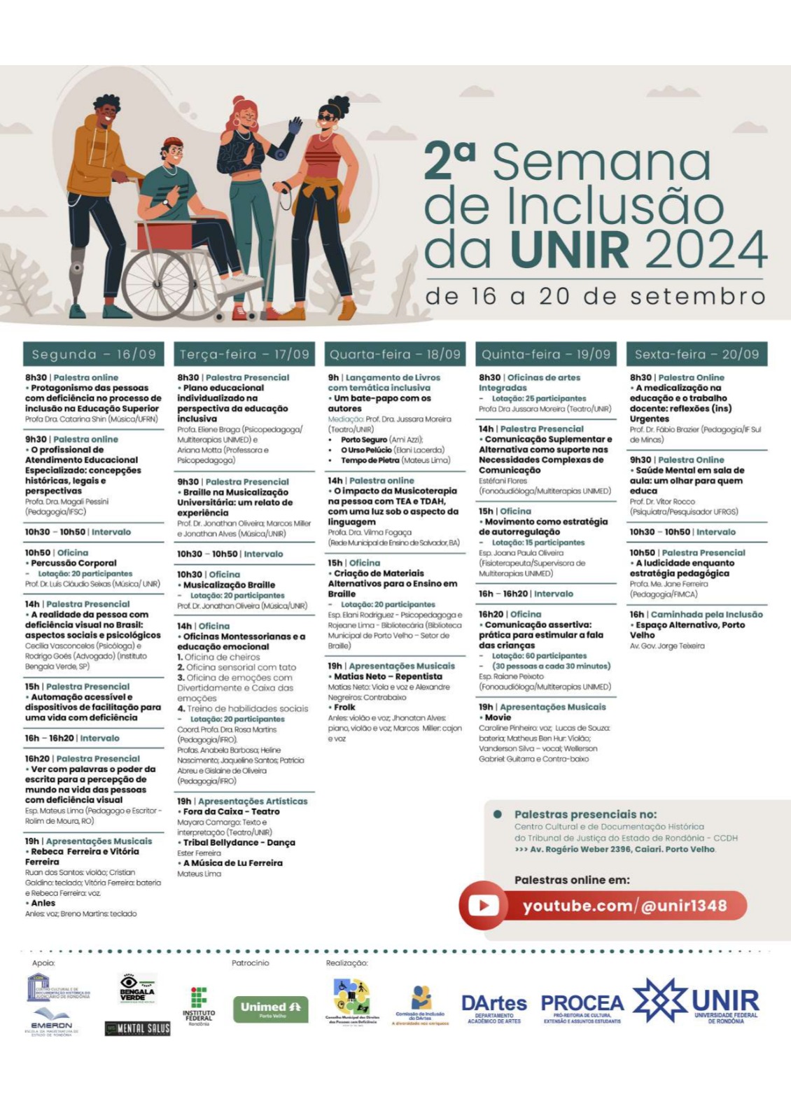 O evento é uma atividade de extensão universitária, a partir de uma parceria com a Comissão de Inclusão do Departamento de Artes da UNIR (DArtes) e o Conselho Municipal dos Direitos da Pessoa com Deficiência de Porto Velho, e contará com a presença de profissionais qualificados que atuam diretamente com a inclusão de pessoas com necessidades especiais. A programação é gratuita e aberta a toda a comunidade universitária e local. As inscrições poderão ser feitas diretamente no CCDH e haverá emissão de certificado pela UNIR.